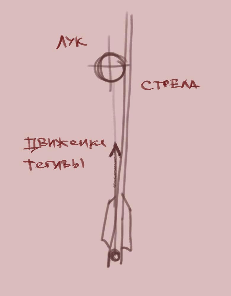 Остается добавить только, что традиционная стрельба из лука, как европейского простого со средиземноморским хватом 2-3 пальцами, так и восточного с кольцом, сложна технически. Дело в том, что современные луки снимают одну из главных проблем - нахождение лука на направлении движения тетивы. Выглядит это примерно так: