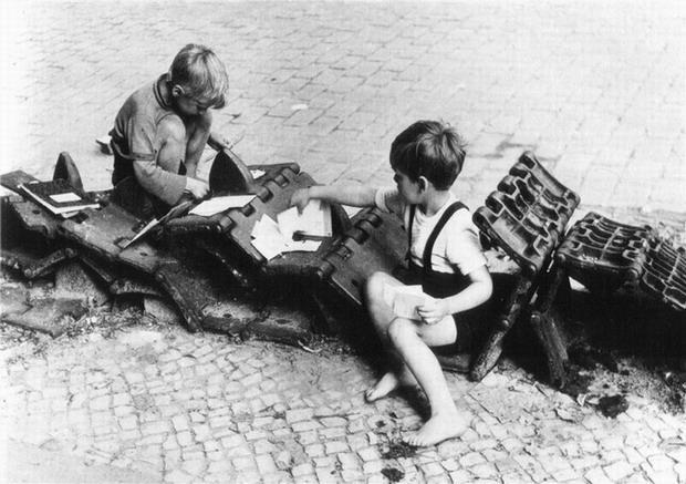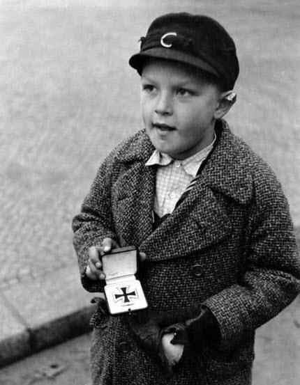 На фото: Мальчик продает награды отца. (Скорее ушлый пацан набрал валявшихся - в Берлине их много было раскидано),