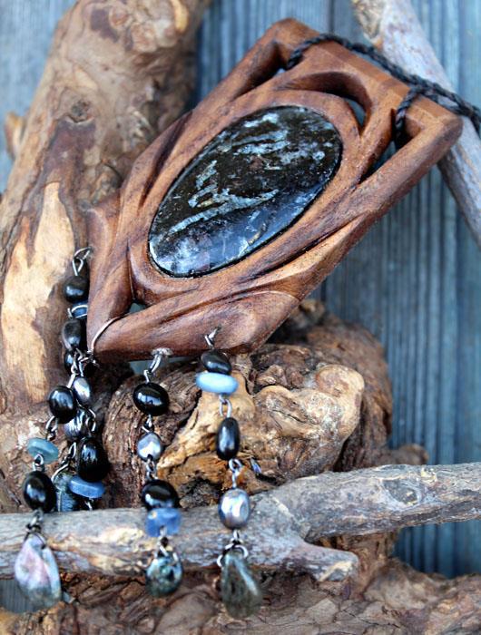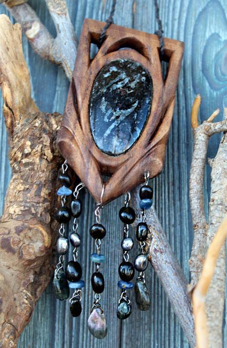 А вот амулет «Надзор Семерых» сделанный по мотивам и под впечатлением от Реттийского цикла. (Древесина — американский орех, камень — черный кианит, бусины — кианти, гиперстен,турмалин, пирит, черный агат. 10 на 5 см., длина с подвесами 15,5 см.)
