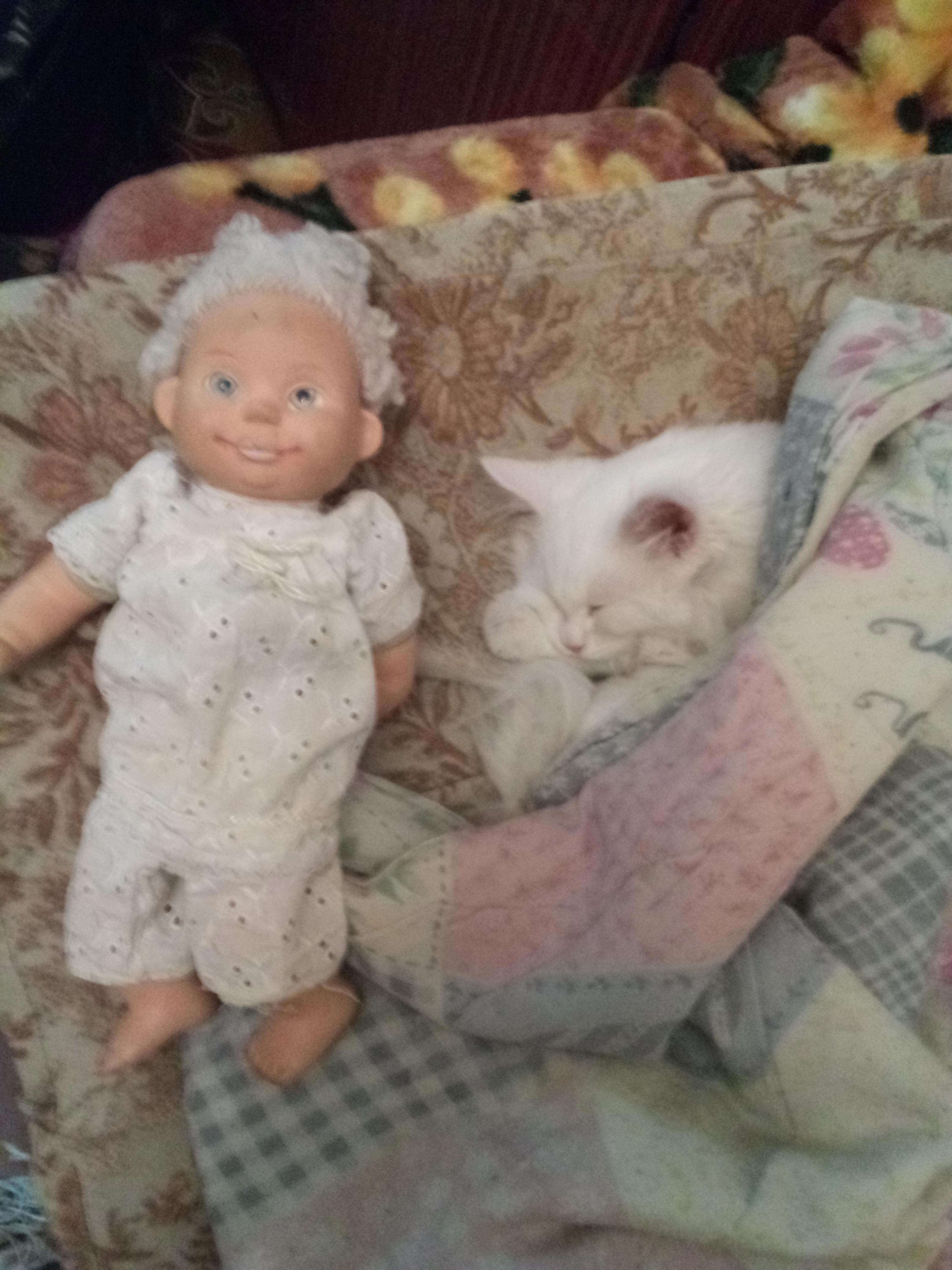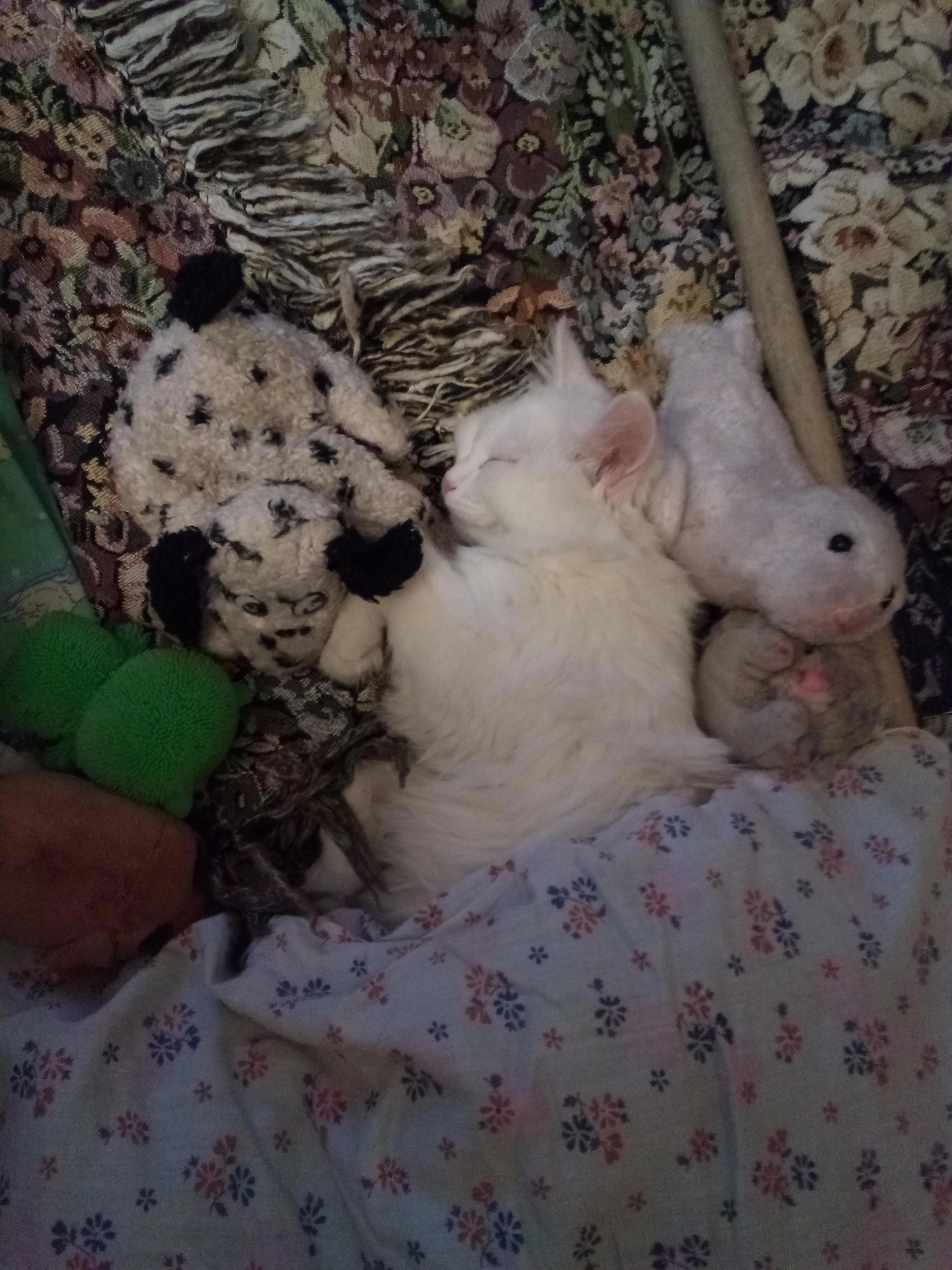 Человеческий детёныш проникся страстным сочувствием к кошачьему, и первое время Коша спала в окружении самых любимых (а потому самых задрипанных))) игрушек.