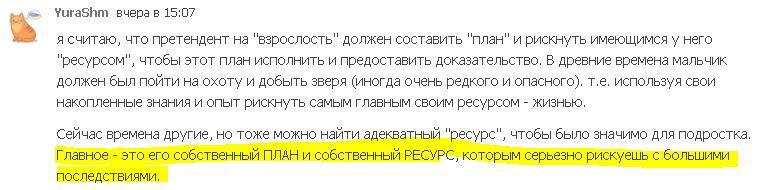 Дядька ЮраШим (как это вообще читается?!) предлагает очень правильный вариант взросления - инициация. Думаю как раз после инициации, в каком бы виде она не проходила, юным коммунистам можно будет выдавать личный маузер, лазерный пистолет или световой джедайский меч - не суть важно.