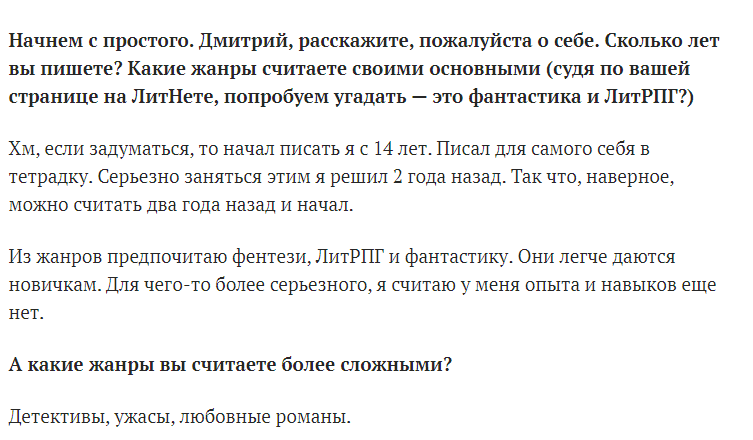 Автор: ТимурПредыстория: знакомый, увлекающийся литературой, скинул мне некоторые фрагменты из интервью с успешным начинающим писателем, творящим в жанрах фэнтези, ЛитРПГ и фантастики, в каком контексте - не скажу.