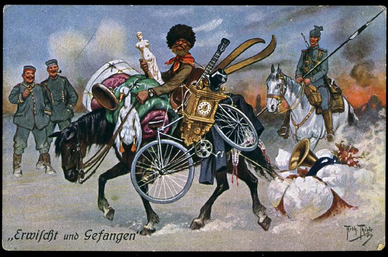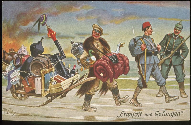 Открытки начала войны, все еще веселые и доброжелательные, французы в своей шикарной униформе, со столь любимыми французскими женщинами и немецкими пулеметчиками красными штанами и кепи, спаги сворачивает сигаретку для немца, трофеи у пленных еще не изымают в самом начале. При этом русские, например, выставлены банальными дикими грабителями, а вот англичане - лицемерами, на что указывает замаскированный флагом Красного креста пулемет. Вообще показалось, что намеков и отсылок на кажждой картинке полно. и да - художник постарался максимально точно представить и униформы и оружие, за что ему бесспорный плюс.