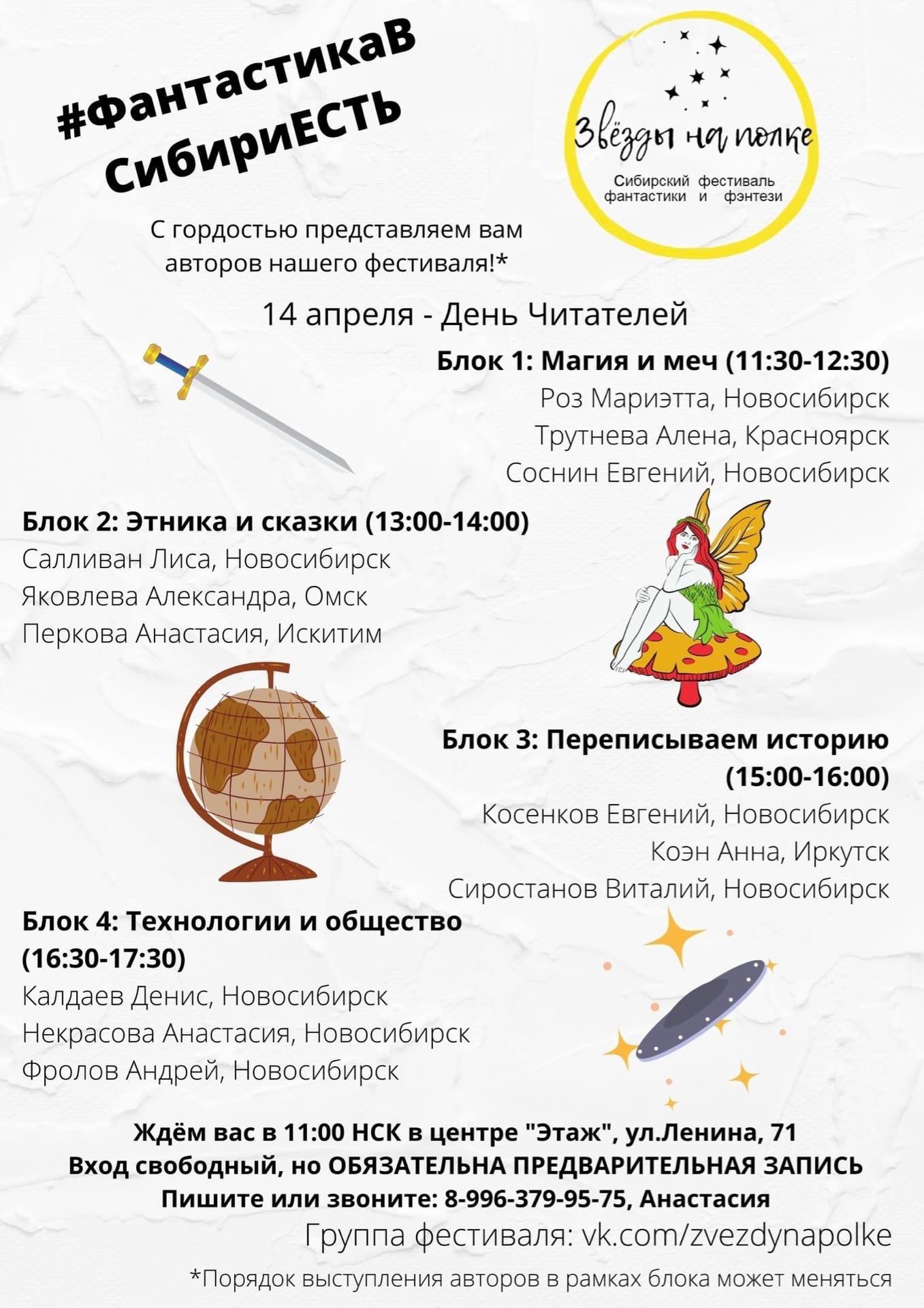 У нас в Сибири ОЧЕНЬ много талантливых авторов, пишущих жанровую прозу. А мероприятий, где они могли бы заявить о себе – мало. Мы хотим это изменить, и поэтому в первый день «Звёзд на полке» организуем для вас знакомство с интересными, яркими и актуальными авторами Сибирского Федерального Округа.
