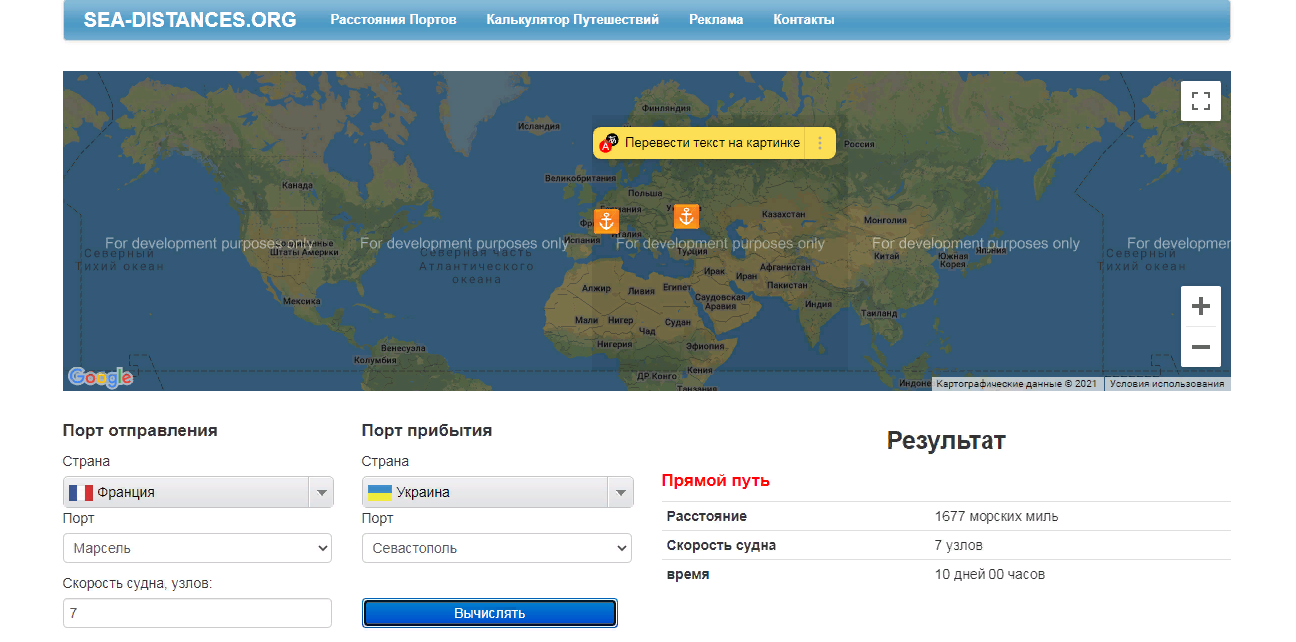 Очень полезный сайт https://sea-distances.org/ Конкретно мне он помог рассчитать расстояние и время от Франции до Крыма.