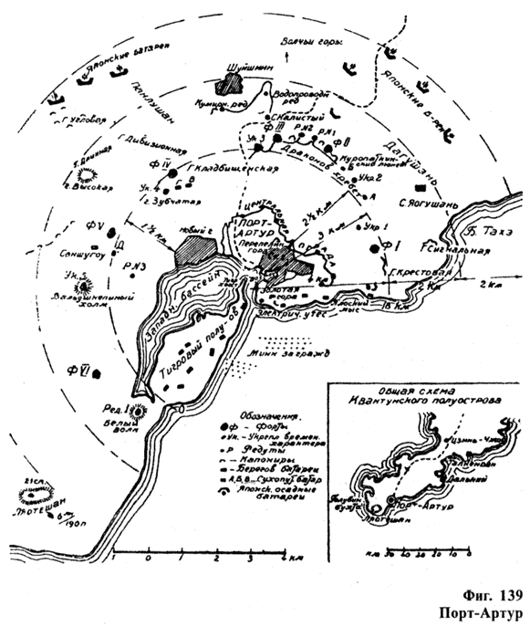 Думаю из сказанного и схемы в общем ясно положение дел в Порт-Артуре. В книге найдёте ещё подробности. Японцы знали про это. Они выгрузили тяжёлые орудия в захваченном с ходу Дальнем, и подтащили их по суше до Порт-Артура. Где поставили свои осадные батареи не далее 8 км от центра города. То есть там, где по всем соображениям должны были быть передовые русские форты... но их там не было. Участь Порт-Артура была сразу же предрешена и никакой героизм исправить отсутствия передовых фортов уже не мог.