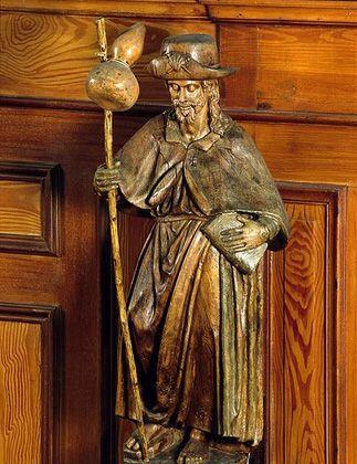Таким видит средневекового паломника современный скульптор: босым, без шляпы и плаща, но с непременной раковиной, посохом и калебасой.