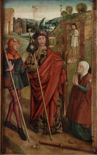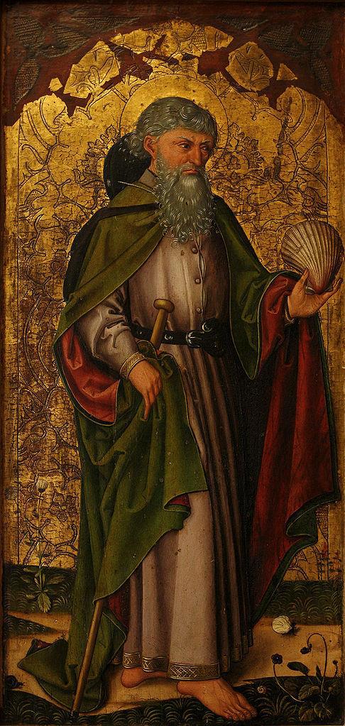 А так неизвестный немецкий или североитальянский мастер изобразил Святого Иакова в виде паломника. На этом образе, датируемом 1475 годом, апостол показан с посохом, с раковиной и босиком. Всё, как полагается по канону! Только калебасы нет, но в имперских землях, скорее всего, о такой экзотике не слыхали.