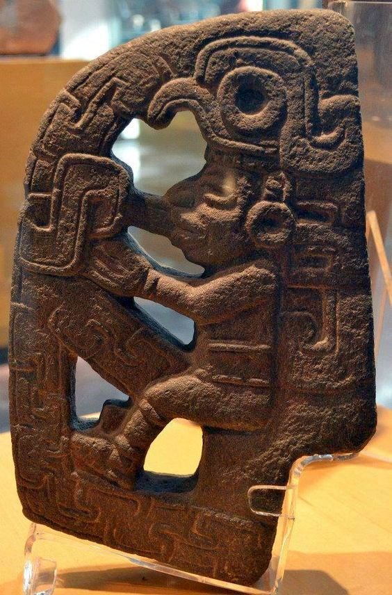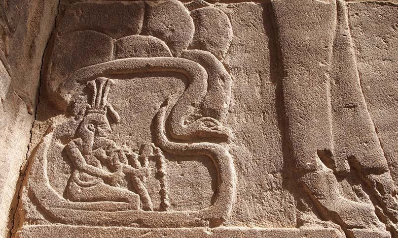 Вот, например, образец древнего искусства, известный под названием «стела из Ла-Вента». Её связывают с другим древнем народом Америки – ольмеками. Есть мнение, что здесь мы видим изображение пресловутого «Пернатого Змея», которого боготворили многие племена Нового Света, хотя и под разными именами. Интернет сообщает, что майя его звали Кукульканом, ацтеки – Кетцалькоатлем, а киче же, напротив – Кукуматцем. Хотя разница могла быть просто результатом различий в произношении. Функции богоподобного Змея были у всех одинаковые – он являлся для того, чтобы научить людей чему-нибудь полезному. Такой вот самоходный университет, оснащённый манипуляторами. Кстати, о манипуляторах и управлении. Вот оно – это каменное изображение:
