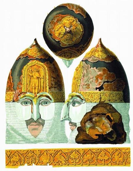 Шлем Ярослава Всеволодовича. Прорисовка Ф. Г. Солнцева из издания «Древности Российского государства». Реконструкция полумаски ошибочна.