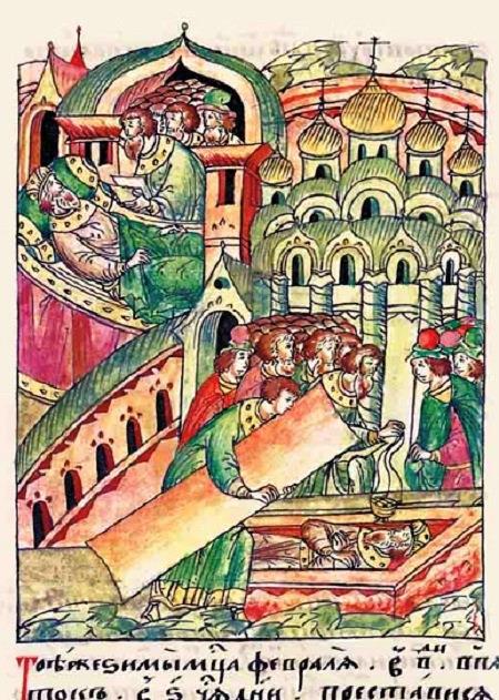 Смерть Константина Всеволодовича. Миниатюра из Лицевого летописного свода.