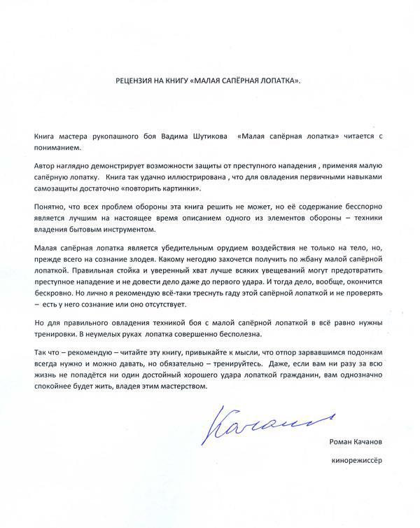 Вадим Шутиков, переработав как общедоступные так и редкие материалы, воссоздал самобытную систему рукопашного боя, основами которой он делится в настоящей книге. Говоря о представленной книге, в первую очередь следует отметить простоту и доступность изложения – любой практик рукопашного боя с лёгкостью поймёт, каким образом следует выполнять описанные движения и приёмы. По моему мнению, в настоящем виде книга может служить учебным пособием младшему командному составу армии для обучения рядовых, так как, боевое применение шанцевого инструмента является прерогативой армейских пехотных частей и войск специального назначения. Бойцам специальных подразделений полиции, участковым и оперативным работникам я бы рекомендовал ознакомиться с данной книгой, чтобы в случае, если в процессе работы им будет необходимо обезвредить и задержать преступника, вооружённого малой пехотной лопаткой, они могли бы прогнозировать его боевые возможности. Считаю, что в предоставленной книге крайне мало освещён вопрос приёмов защиты от применения малой пехотной лопатки. Несмотря на свой немалый опыт занятий различными системами рукопашного боя, я бы предпочёл обороняться от противника, вооружённого малой пехотной лопаткой, имея огнестрельное оружие. По эффективности нанесения повреждений противнику малая пехотная лопатка намного превосходит нож, топор или стек. С точки зрения работника правоохранительных органов могу сказать, что я бы ограничил доступ к данной книге - вполне возможно, что преступный элемент, ознакомившись с материалами, представленными в книге В. Шутикова, возьмёт МПЛ на своё "вооружение".