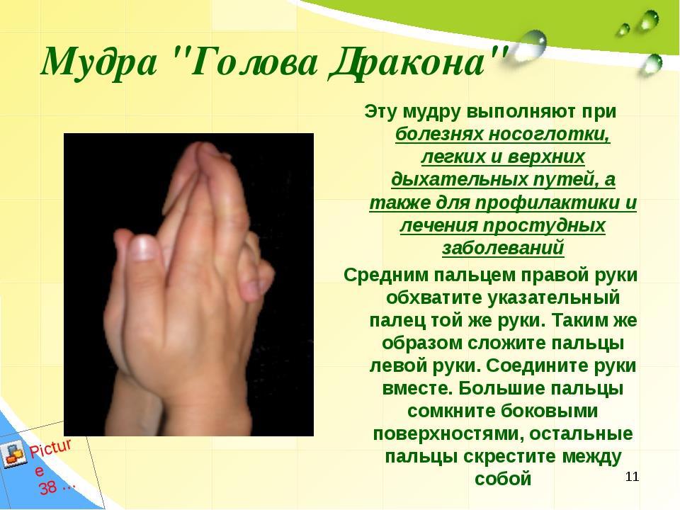 - Делал мудры (сложения пальцев) "Поднимающая" и "Голова дракона".