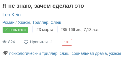 ). Я уже содрал всю инфу с сайта и сложил всё в базу, она у меня лежит локально на компьютере, более подробно напишу завтра. Мой скрипт успешно отработал на всех произведениях кроме одного единственного, на котором мой скрипт сломался. Вот оно: