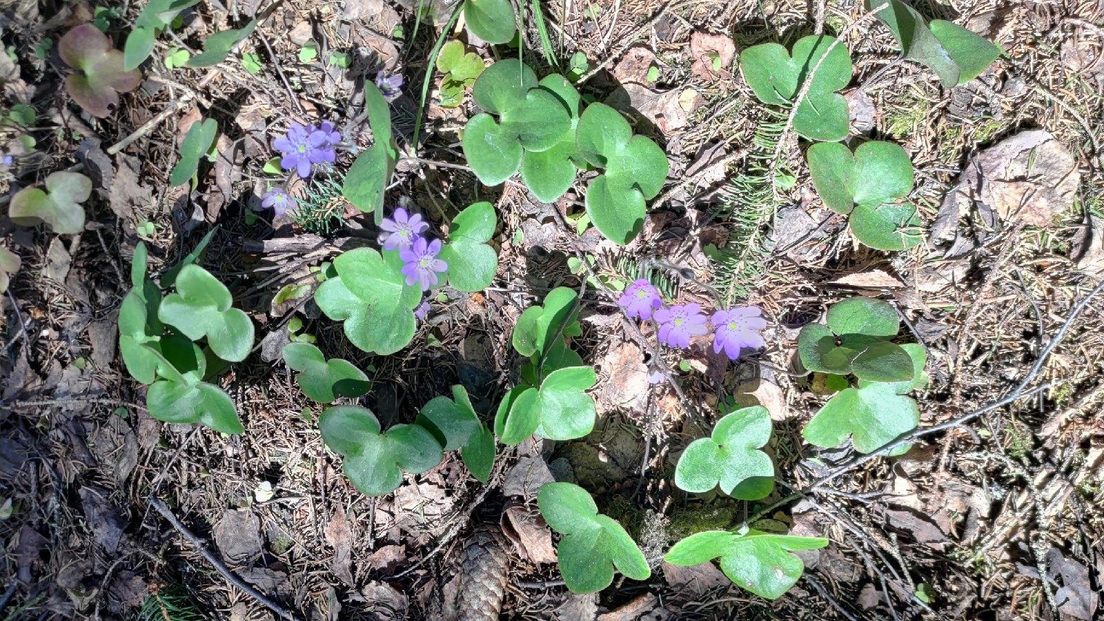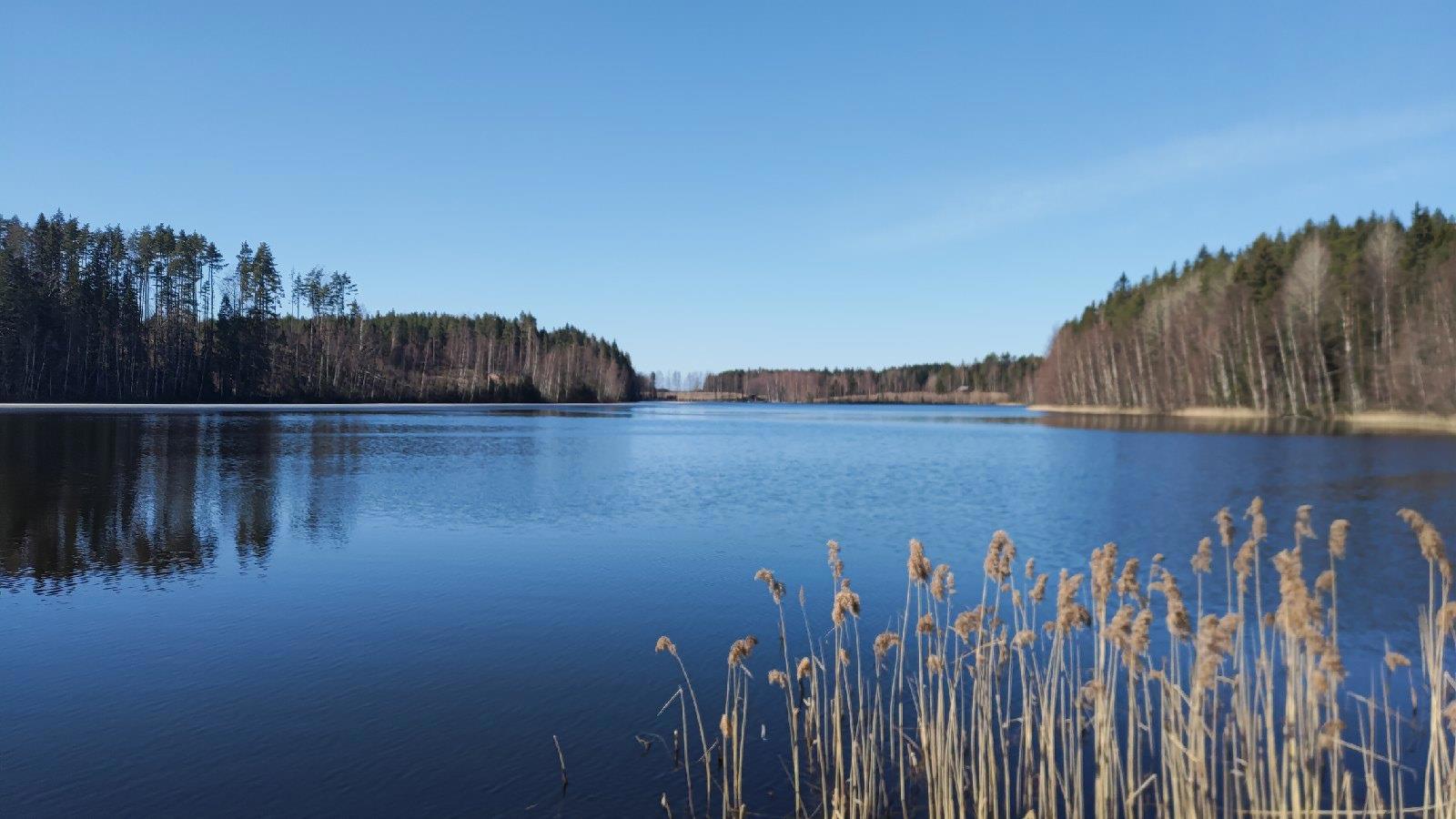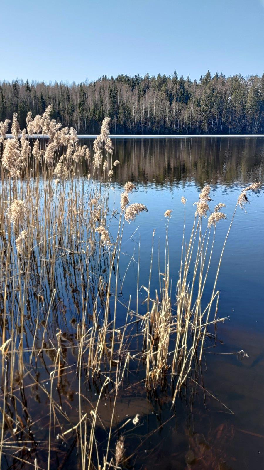 Апрельская природа особенная: охра светлая и ультрамарин. Дороги развезло, бегут ручьи с холмов, цветут первые цветы: sinivuokko, не знаю как по-русски.