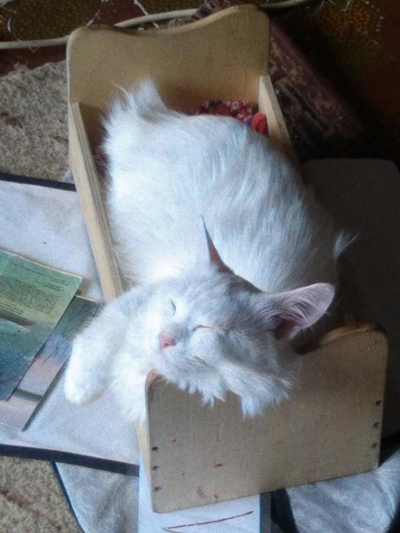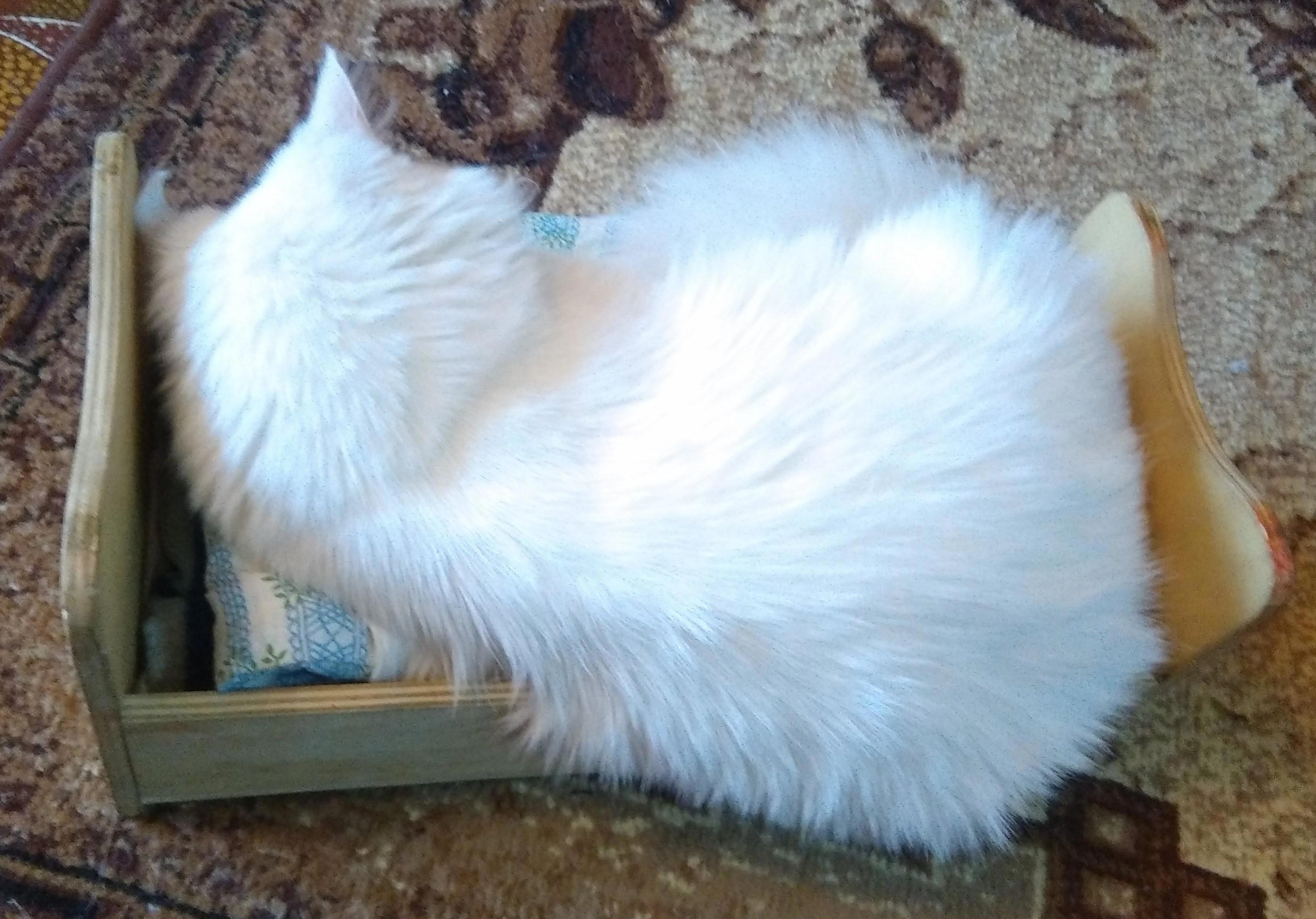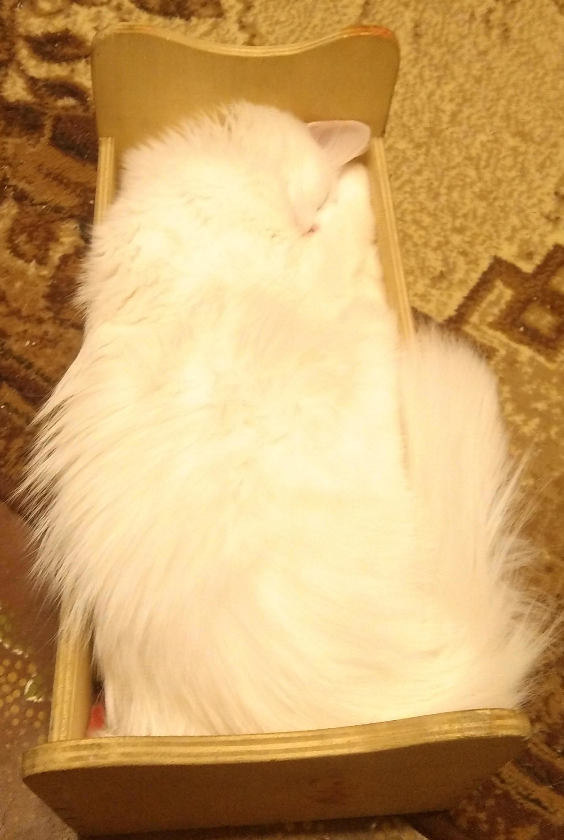 Прошло два года, и наша попа кошка немного выросла, но если ей хочется помедитировать спокойно – она по-прежнему ложится в маленькую кукольную кроватку