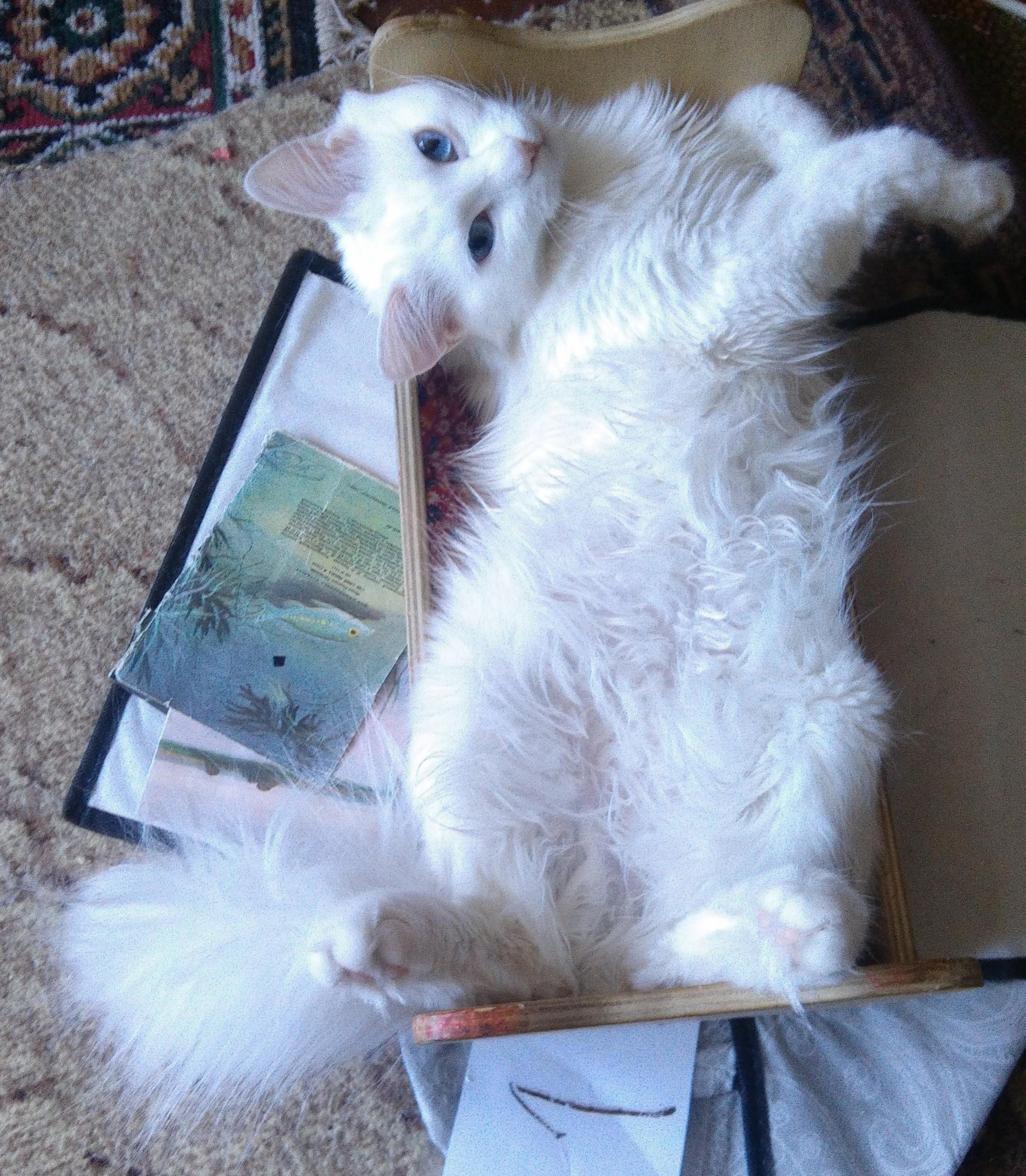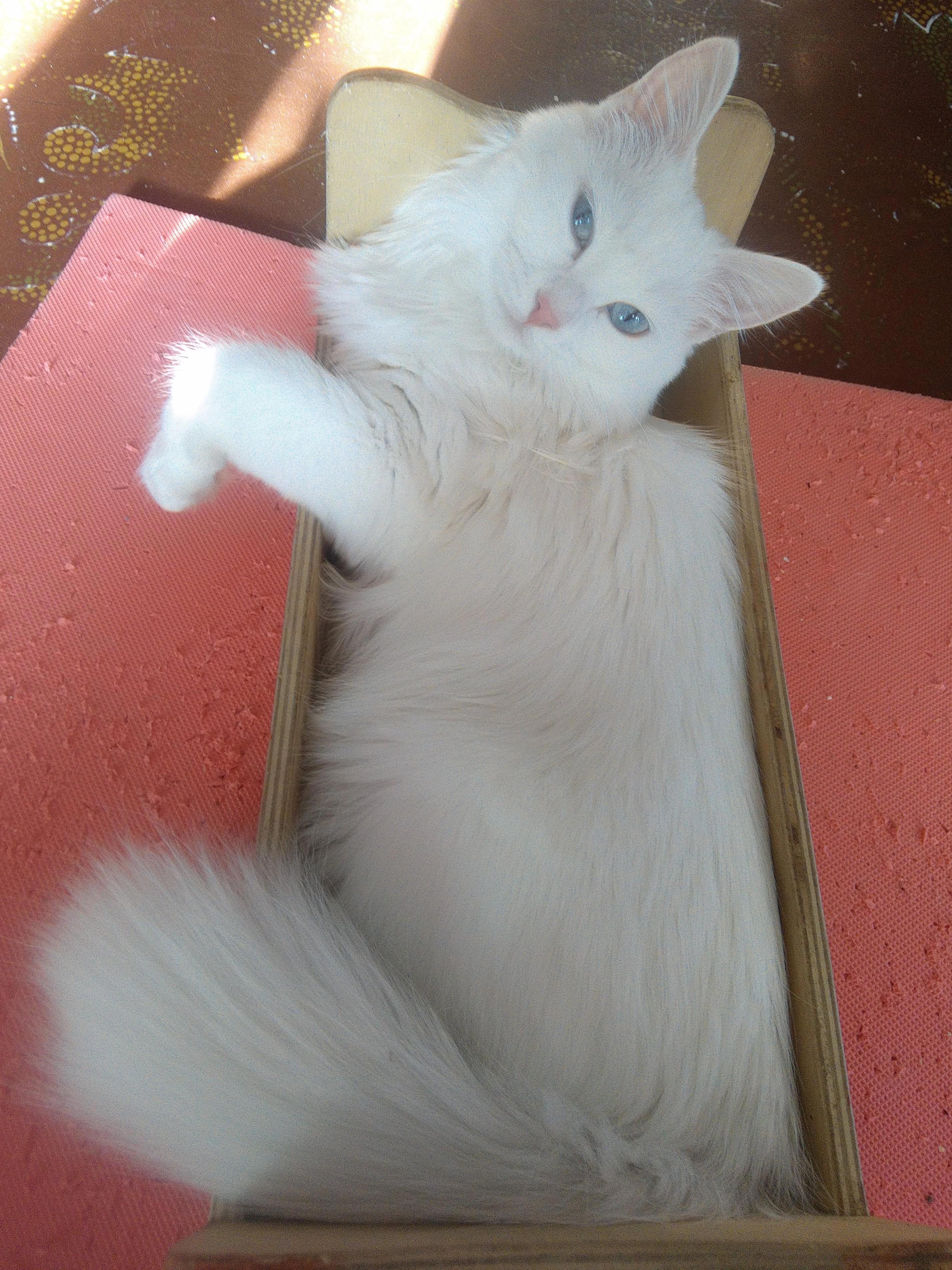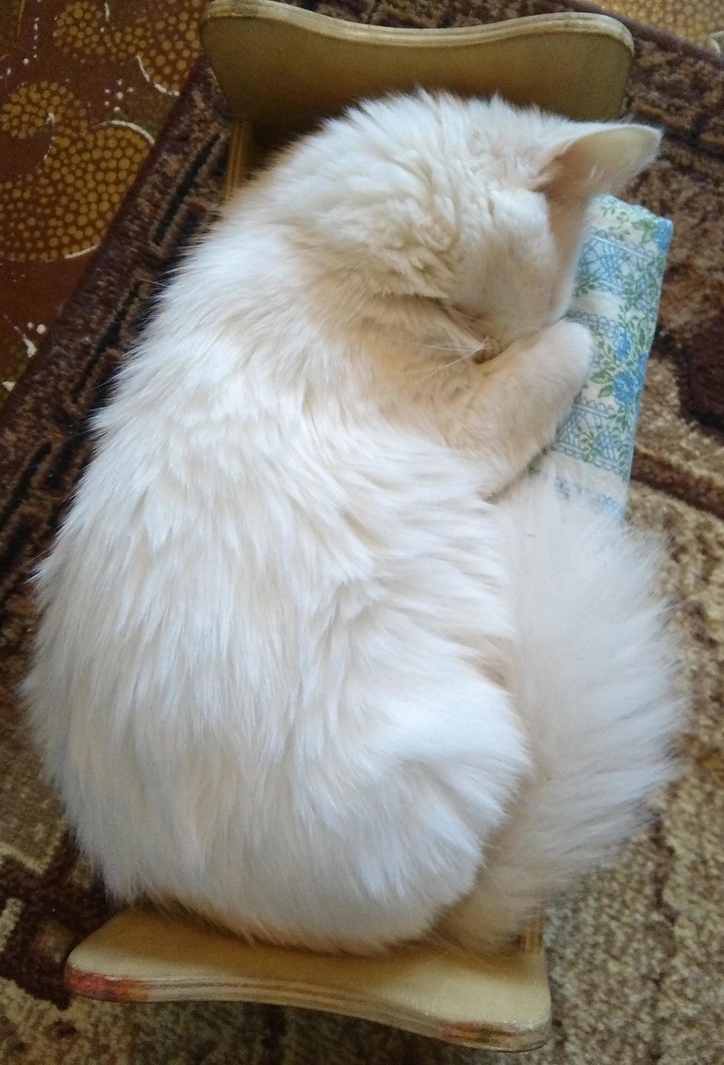 Прошло два года, и наша попа кошка немного выросла, но если ей хочется помедитировать спокойно – она по-прежнему ложится в маленькую кукольную кроватку