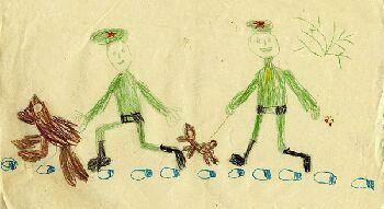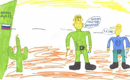 Судя по счастливым лицам и шапкам набекрень пограничников – они дембели. Бегут они неспешно, так как, судя по следу, они гонятся за одноногим нарушителем государственной границы. Нарушитель бросил в них гранату, как видно по кусту, летающему в небе (см. верхний правый угол.). Судьба нарушителя уже предрешена художником: на поводке у пограничников ручные разъярённые медведи.