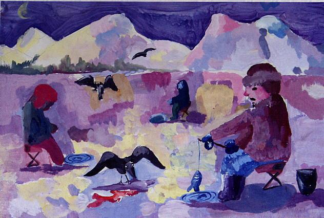 И только один выжил в суровых условиях! Что же это за человек? Его глаза пусты - это символ пустоты души. Это объясняет, почему он так жесток: он привязал рыбу на короткую леску, чтобы она не доставала до воды и издевается над ней. Недавно похожим образом он замучил белку, тушка которой лежит на переднем плане рядом с вороной. И, - о ужас! - он замучил выловленного из-подо льда бобра!
