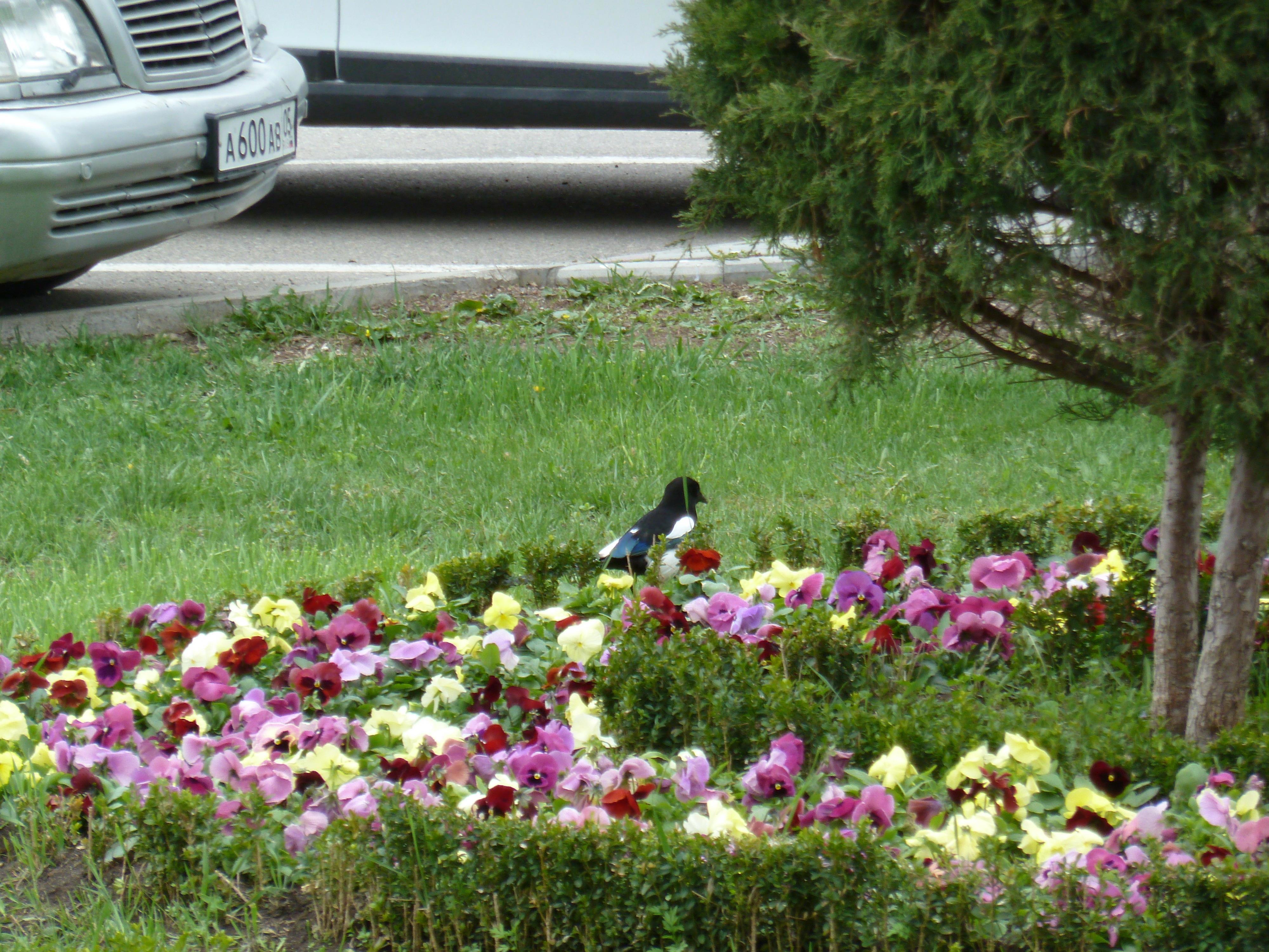 Цветы в цветнике еще не распустились, но этому персонажу нужны вовсе не они…