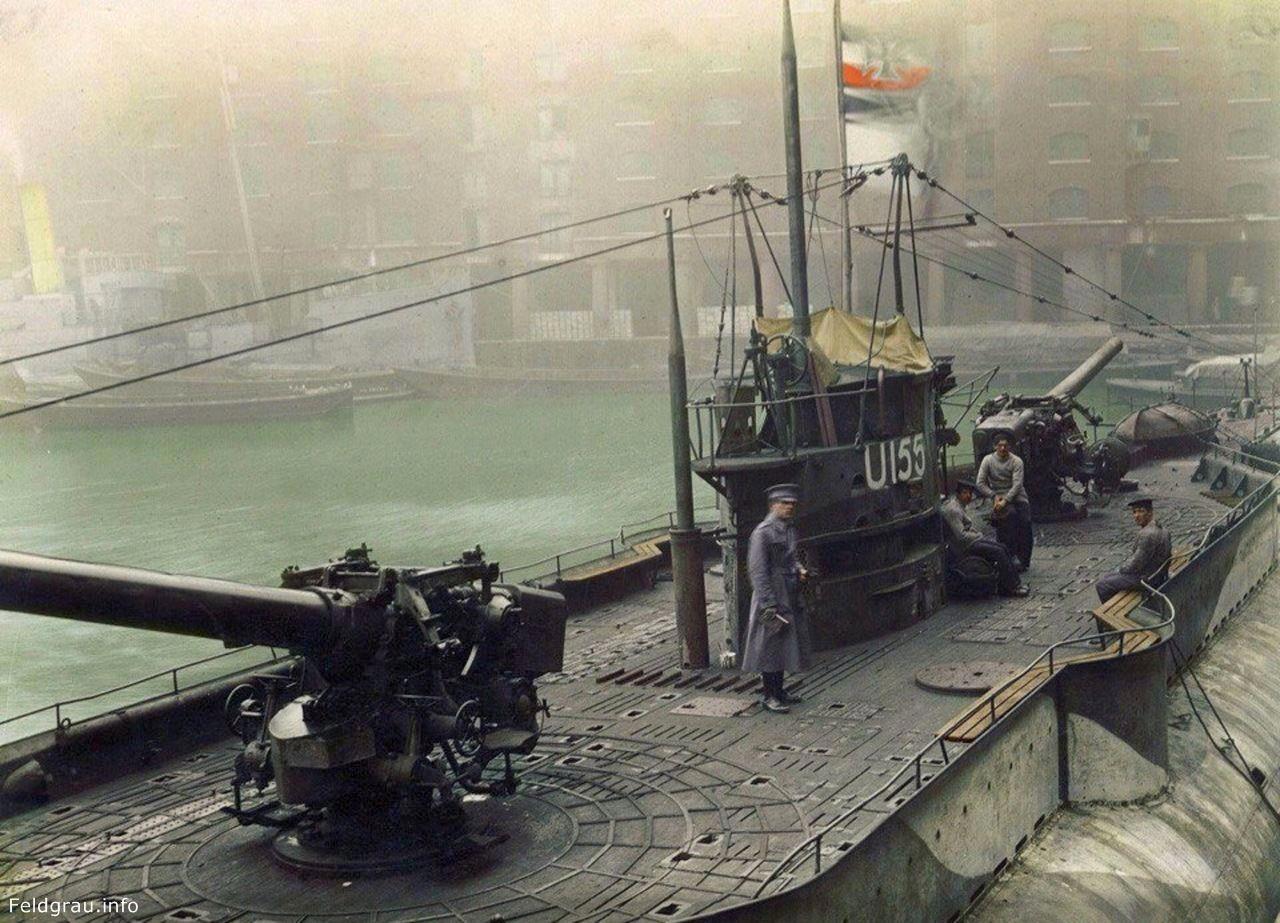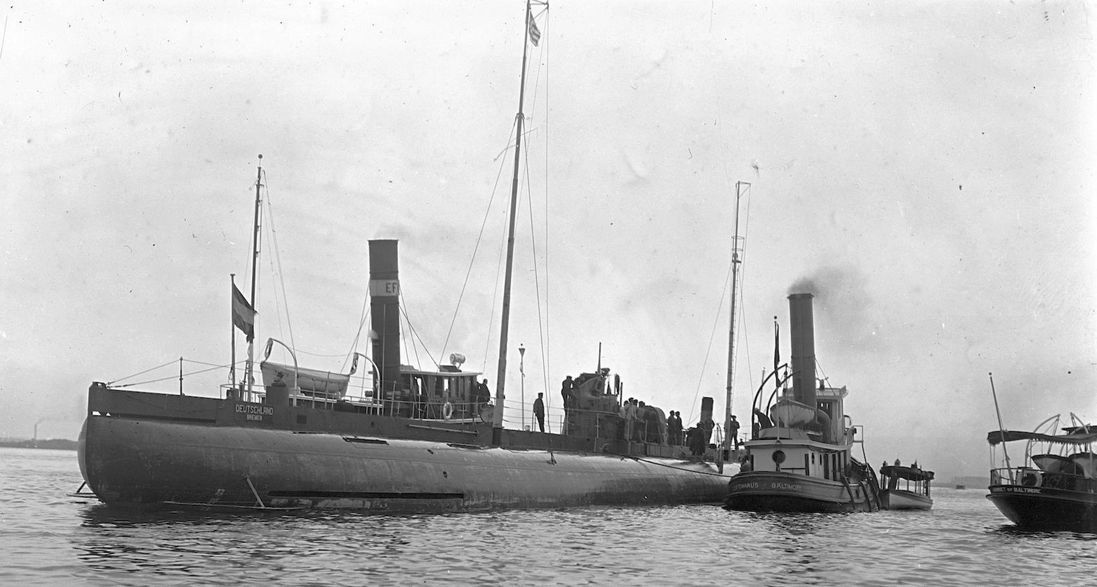 Хороший снимок потому, что рядом стоит лодка более традиционных размеров. Есть с чем сравнивать. Первое, что может броситься в глаза внимательному читателю, это то, что пушек на ней нет. Да, всё правильно. Лодка изначально была построена не как боевой корабль, а как транспортник. Самый обычный, точнее самый необычный из всех транспортников, потому как подводный. Это последствия юридически-политических игр мировых держав между собой. То есть пока англичане, французы и русские воевали с немцами, «нейтральные» США грели руки на этом огне, продавая и немцам тоже дефицитное сырьё и материалы. Военным кораблям нельзя заходить в нейтральные порты США? Так мы, мол, лодку проверили – никакого оружия на ней нет. Поэтому – «вэлком»! Чисто бизнес с чисто грузовым судном. На нём в Первую Мировую в Германию доставляли всё то, чего так не хватало для продолжения войны. Лодка могла принять на борт 700 тонн груза и отвезти его за 12 тысяч морских миль. Причём при появлении нескромных глаз она легко ныряла под воду. Говорят, что затраты на строительство первой лодки окупились в первом же рейсе в США. Вот эта чисто мирная подводная лодка вполне мирно буксируется двумя буксирами: