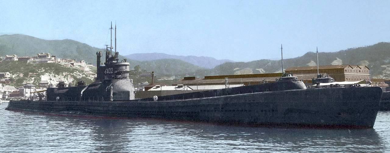 Запустить все три таких самолёта японцы могли (если всё идёт хорошо и погода хорошая) за 47 минут. На лодке также установили кран для того, чтобы извлекать самолёты из воды. В общем – у японцев получилась серьёзная боевая единица с уникальными характеристиками, хотя и не без недостатков. Главные недостатки – плохая управляемость, скверная остойчивость, малая глубина погружения (чуть больше 80 метров). И погружалась лодка тоже жутко медленно. Чтобы скрыться под водой ей было нужно почти минуту. Короче вот фотография головного корабля этой серии, который известен, как I-400: