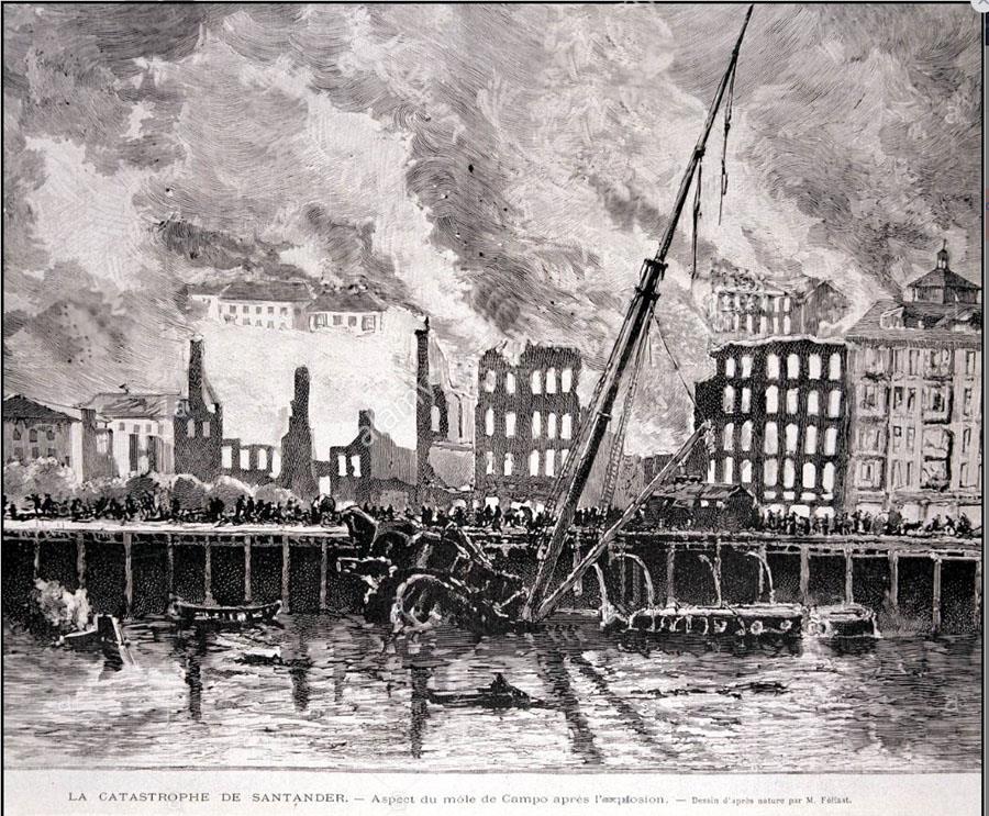 Взрыв и пожар в порту Сантандера 3 ноября 1893 года. Рисунок из газеты того времени.
