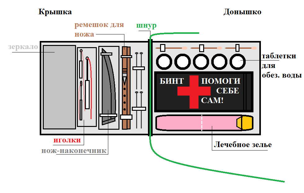 9) Лечебное зелье. Собственно, объясняет отсутствие иных медикаментов. Принимается в случае получения различных ранений по-разному, чаще всего - половина внутрь, половина выливается прямо на рану или царапину. При отравлении какой-нибудь гадостью, простуде или, простите, диарее - принимается только внутрь. Можно смазать ноздри и использовать как временный фильтр.