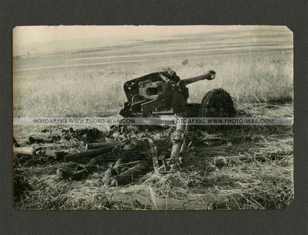 Автор: Николай БергОстатки немецкого ПТО 75 мм. с расчетом. Судя по ополовиненному щитку - типовое попадание осколочного снаряда в орудие. 18+