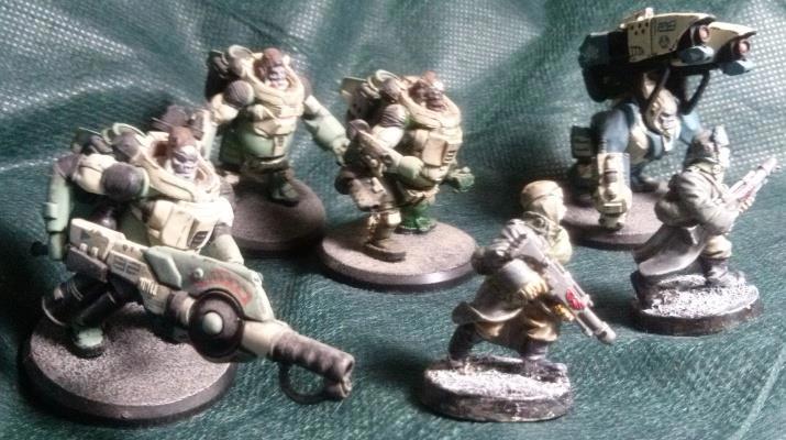Это выпускала давно почившая французская фирма Confrontation для своей игры AT43 - по миру альтернативной истории, где во Вторую Мировую вторглись ещё и инопланетяне. Там были разумеется и русские, но мне вот достались только эти гориллы. Ну не беда - русские у меня есть от Games Workshop, вон они перед гориллами стоят. Правда тот что в центре как-то больше на немца под Москвой зимой 1941 смахивает. Вот так нас представляют в далёкой Англии.