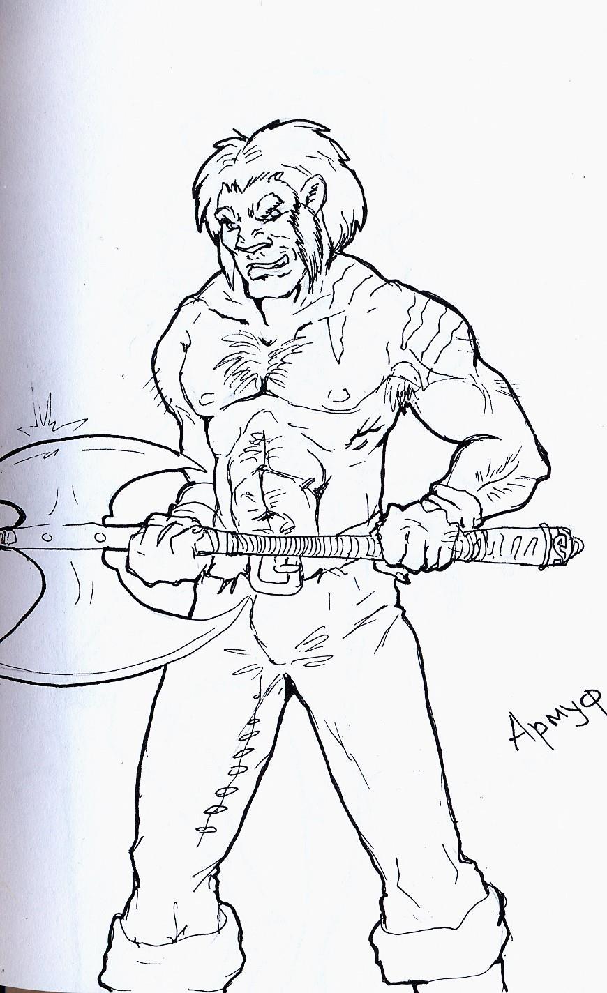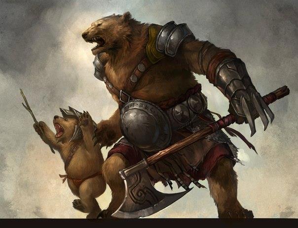 Начнём, пожалуй с полуоборотня-урсолака Армуфа, махрового наёмника, предводителя отряда Рубак. В отличии от чистокровных оборотней, Армуф не может принимать облик медведя полностью: только становится крупнее ростом и волосатее, чем напоминает скорее йети, чем медведя=)) В Сети прискорбно мало картинок, изображавших бы урсолаков как-то поспокойнее, чем в состоянии "пасть до ушей"... Пользую то, что есть плюс мой арт.