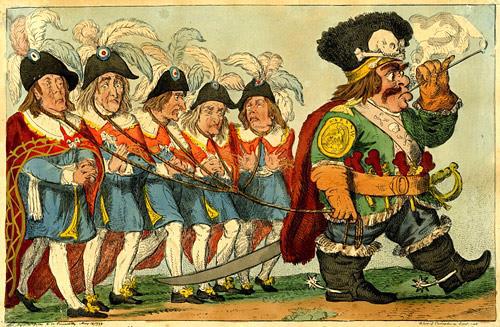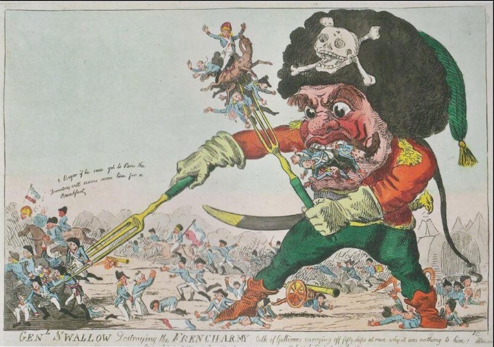 Исаак Крукшенк. "Генерал Глотка, истребляющий французскую армию подобно Гулливеру, уносящему пятьдесят кораблей сразу, причем без всяких усилий!". 1 июня 1799 года