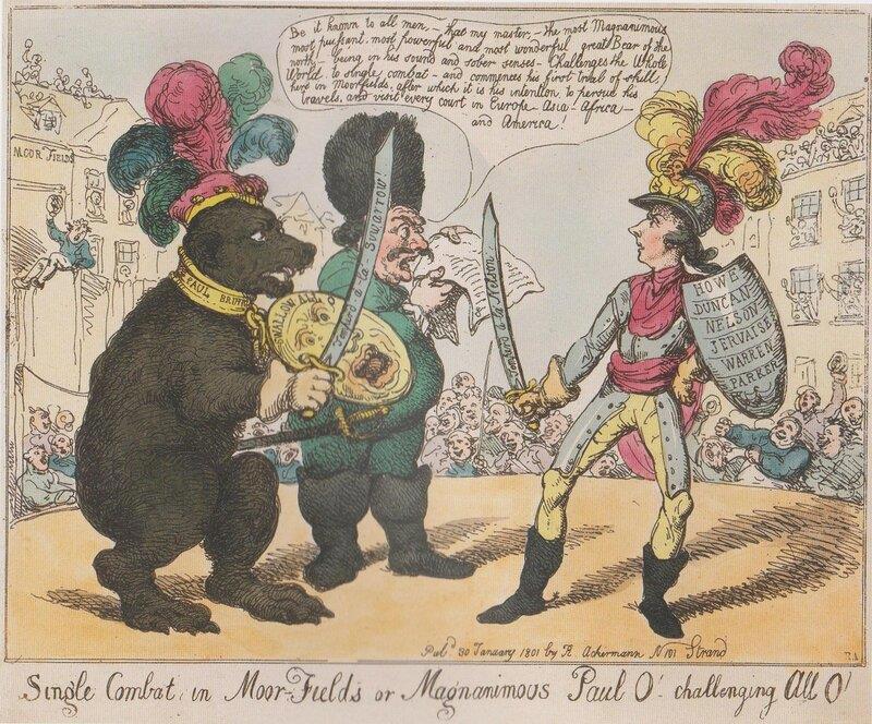 Поводом для карикатуры послужил вызов на поединок, брошенный Павлом I всем монархам Европы.