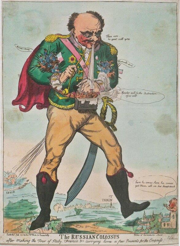 Исаак Крукшенк. "Русский Колосс, предприняв путешествие по Италии, Франции и так далее, несет домой несколько подарков для императрицы". 15 июля 1799