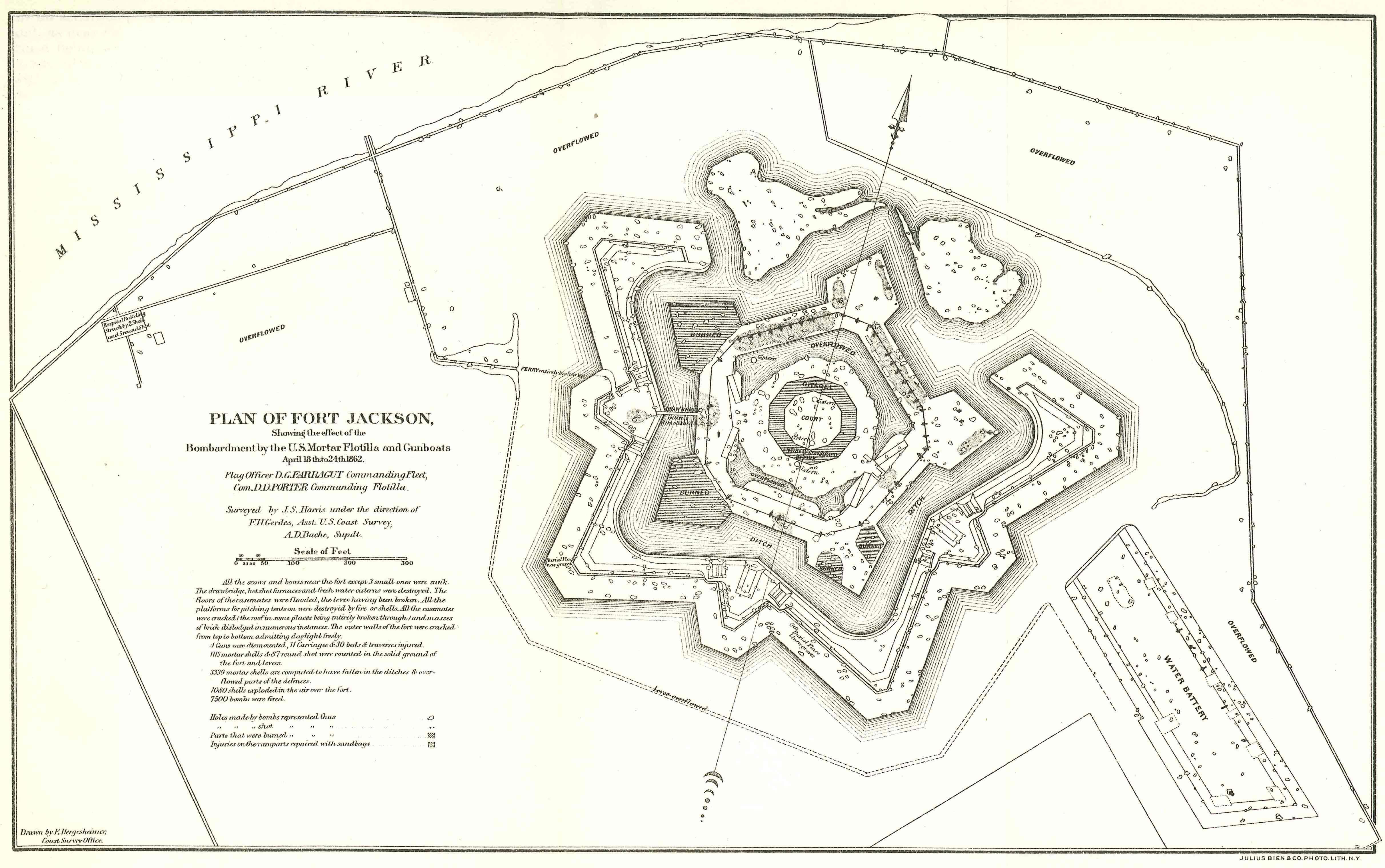 Итак, флот северян не выглядел «слишком большим», а чтобы попасть в город ему пришлось бы проползти по узкой протоке реки Миссисипи шириной в 1500–1700 метров под огнем обоих казематных фортов. Это казалось нереальным.