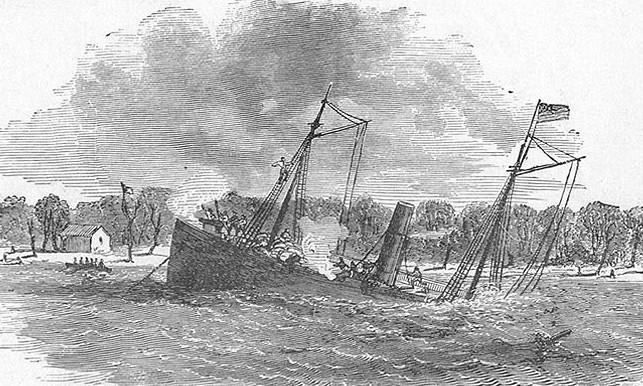 (картина "Штурм Нового Орлеана" - показана эскадра северян и форты южан: слева "Джексон", справа - "Сент Филипп", а вот крайняя чуть ниже странная посудина, похожая на рыбу - это как раз "Манассас", жутко увеличенный художником)