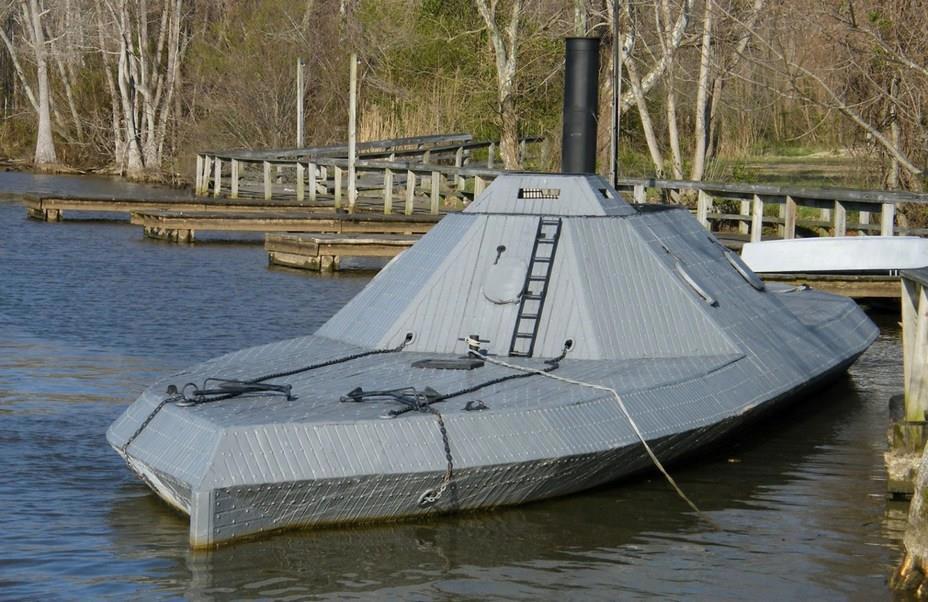 В завершение 1864 года стало гротескное отчаянное сопротивление броненосца Конфедерации «Албемарла» (CSS Albemarle). Небольшой и тихоходный броненосец, водоизмещением всего в 650 тонн, вступил в строй 17 апреля 1864 года. В тот же день, он двинулся вниз по реке Роанок, намереваясь атаковать стоявшие в ее устье федеральные корабли. Эта операция была задумана с целью лишить позиции северян на берегах реки поддержки флота перед планирующейся атакой на Плимут. Его встретили две канонерских лодки северян «Майями» и «Саутфилд», каждая водоизмещением в 750 тонн и вооруженная пятью орудиями Дальгрена и Пэррота. Соотношение сил было вроде в пользу Федерации, поскольку бронирование «Албемарла» было весьма слабеньким (100-мм наклоненной под 45 град), а скорость хода у канонерок существенно выше. Завидев идущие на него корабли северян, капитан «Албемарла», Джеймс В. Кук, решил, что они собираются таранить его, и отвернул в сторону, едва не вылетев на мели у южного берега реки. Канонерки проскочили мимо, и воспользовавшись этим, Кук резко развернув броненосец, протаранил «Саутфилд», при этом таран броненосца крепко застрял в борту вражеского корабля, что тот едва не утянул конфедерата за собой. С трудом освободившись от потопленного «Саутфилда», «Албемарл» подвергся атаке со стороны «Майями», но броненосец южан сумел побить и его, заставив убежать обратно в залив. Стоит заметить, что любовь к таранным атакам в ущерб артиллерийскому огню стало просто навязчивым тактическим безумием конфедератов. Обычно эти атаки проваливались из-за тихоходности и слабой маневренности их кораблей, но тут внезапно получилось…