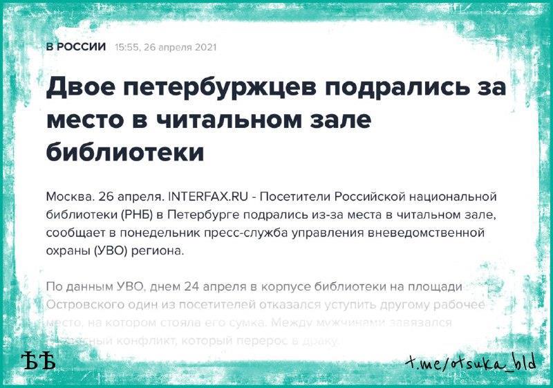 Автор: Полина ЛашинаДвое петербуржцев подрались за место в читальном зале библиотеки. Даже на знаю какой тег ставить посту - "юмор и стеб" (или питерцы не шутили?