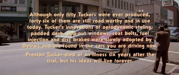 В заключительных титрах отражены исторические факты: "Из пятидесяти выпущенных Такером автомобилей сорок шесть до сих пор (на 1988 год - ничего себе живучесть!) всё ещё бегают по дорогам. Новации Такера по поводу аэродинамики кузова, безосколочных стёкол, ремней безопасности, инжектора и дисковых тормозов были постепенно внедрены Детройтом и широко применяются в современном автомобилестроении во всём мире. Такер умер спустя шесть лет после суда, но его идеи живы!"