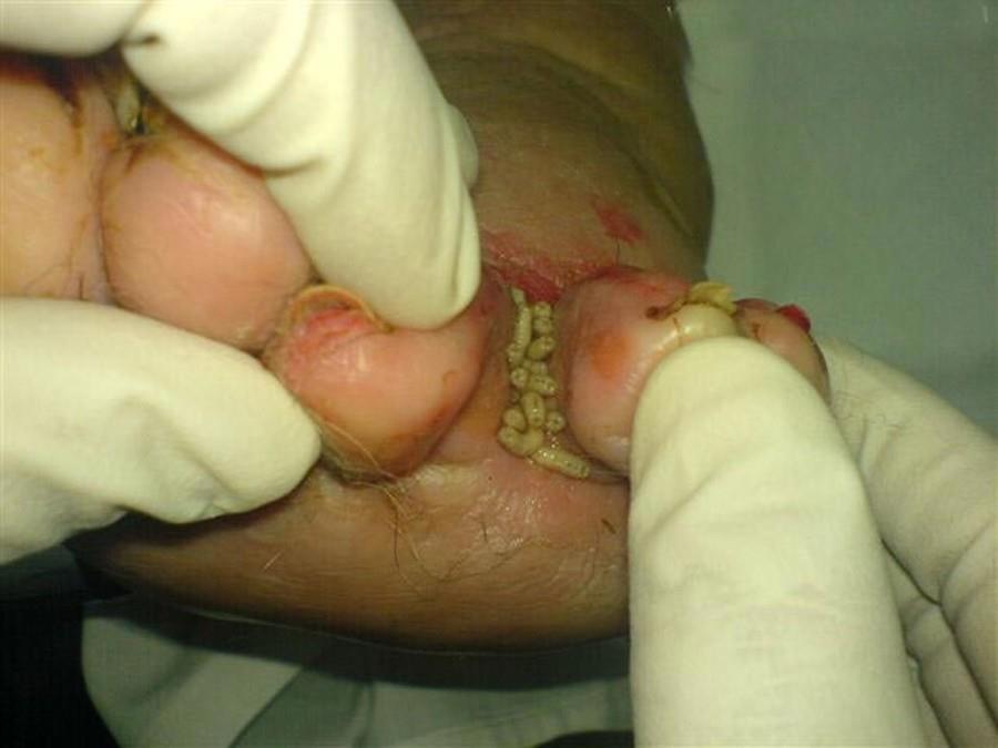 Типовой бомж с опарышами.