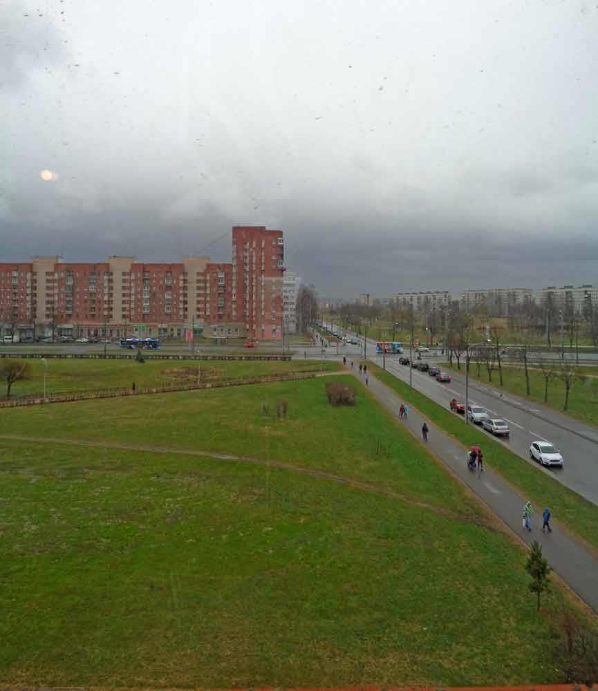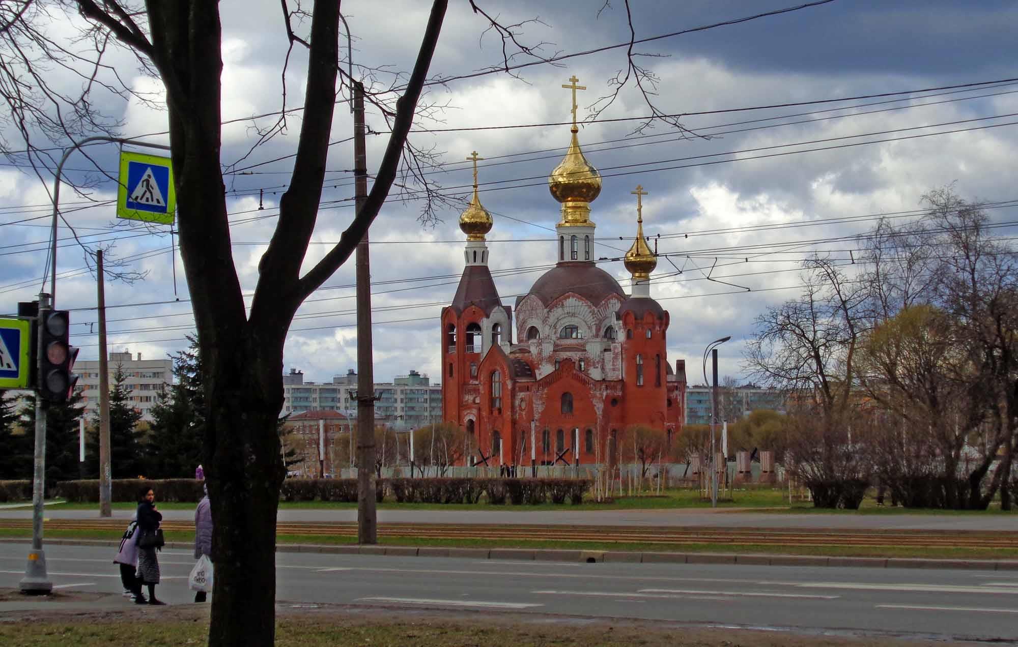 Он стоит на пересечении пр. Ветеранов и ул. Добровольцев. Здесь проходил рубеж обороны Ленинграда и шли очень ожесточённые бои. Перед храмом можно разглядеть мемориал в честь павших.