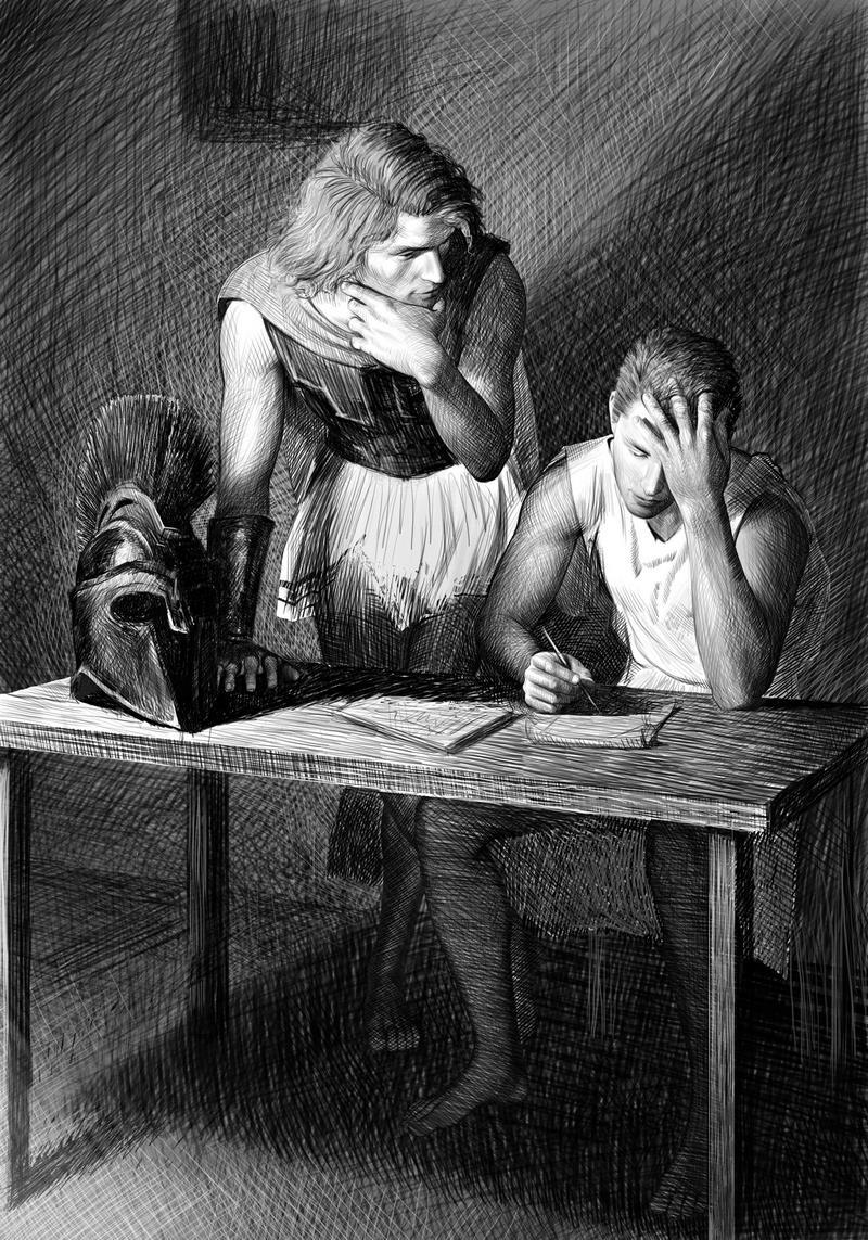 Алкивиад присел рядом. Похоже, Лешина догадка оказалась верной и послание действительно начиналось с обычного приветствия. Теперь они знали несколько букв, и можно было попробовать угадать другие слова. Склонившись над папирусом, они шаг за шагом продвигались в расшифровке сообщения. Каждое прочитанное слово давало новые буквы. Алкивиад словно забыл, что сидит бок о бок с рабом. Он ликовал при каждом новом угаданном слове. Нетерпеливо вырывал у Алексея папирус и радостно хлопал его по плечу.