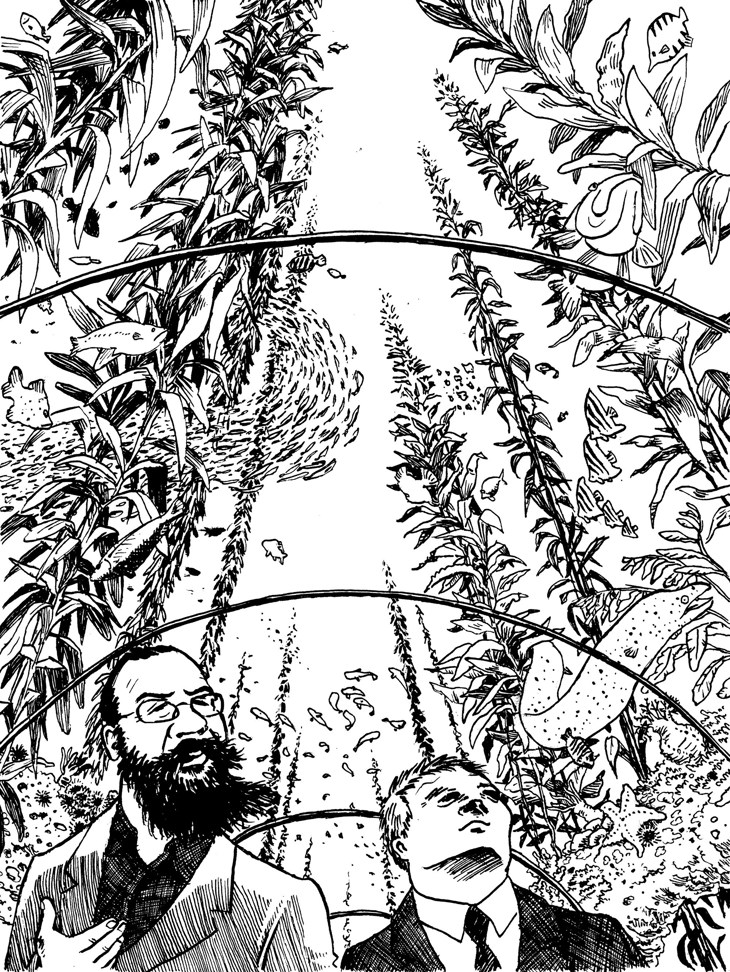 Хозяин двинулся первым, за ним гость. А дальше и в самом деле будто оба ушли под воду. Леонид аж невольно перевёл дух как от прыжка: длинный, извилистый и совершенно прозрачный коридор терялся в синеватой глубине. Вокруг водоросли, много красивых и разных, целые поля, леса и рощицы, колышущиеся в безмолвии. Среди них плавали мелкие жёлтые и золотые рыбки размером от крупного жука до мужской ладони, стаи чего-то окунеподобного. Внизу какие-то донные рыбы вроде камбалы, ракушки, морские ежи и звёзды, непонятные сороконожки, торопливо обгрызавшие ярко-оранжевую морскую звезду. Длинная змееподобная рыбина безмолвно проплыла мимо и спряталась в маленькой пещерке в скале, откуда посмотрела на людей сквозь стекло унылым взглядом, словно жалуясь: понимает, что съесть людей у неё не выйдет, но очень хочется.
