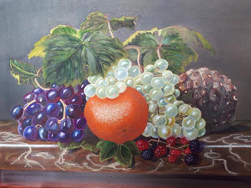 Уже полтора месяца, как я увлеклась этим делом. И вот дошла до своего первого натюрморта. Пыхтела над ним больше двух недель) Понятно, для тех, кто умеет рисовать, это фигня, но для меня такая картина - огромный прогресс, хотя бы потому, что предметы не надо подписывать))) Без подсказок понятно, что виноград это виноград, а листья это листья. И даже вроде бы ананас узнаваем.
