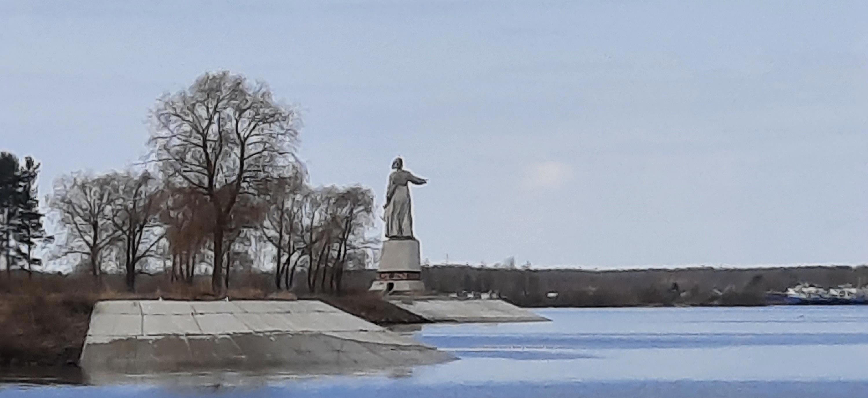 После ГЭС, я забил в навигаторе монумент Мать-Волги, но он оказался на насыпной песчаной косе дамбы шлюзов, со стороны верхнего бьёфа, так что пробраться до него можно только на лодке. Меня вывело на берег, где этот памятник виден из далека, так что фото получилось не суперского качества.