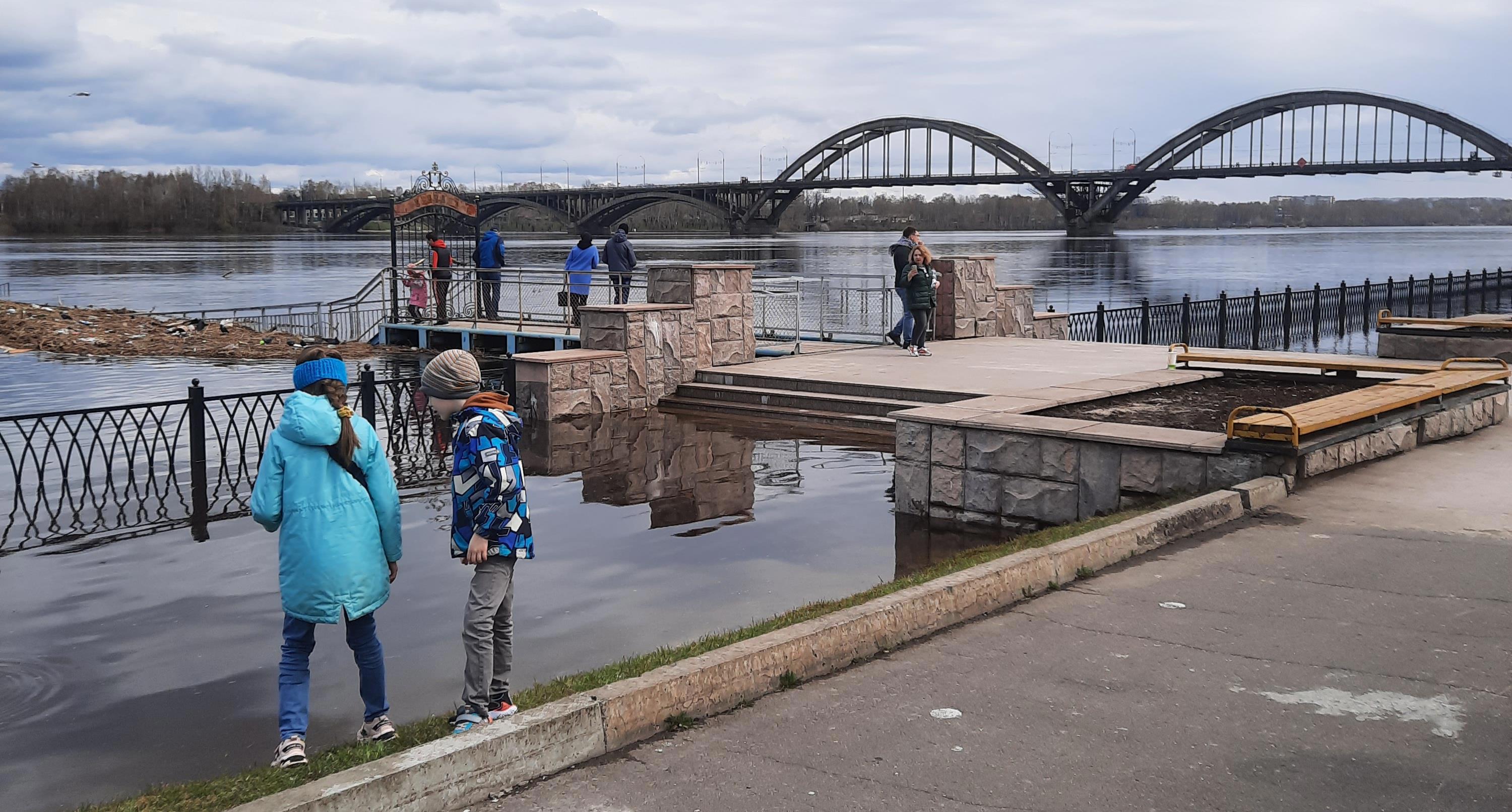 . Еще, видите огромные волны, в этом году из-за осадков пришлось выпустить часть воды в Волгу, поэтому набережные Рыбинска и Ярославля частично затоплены.