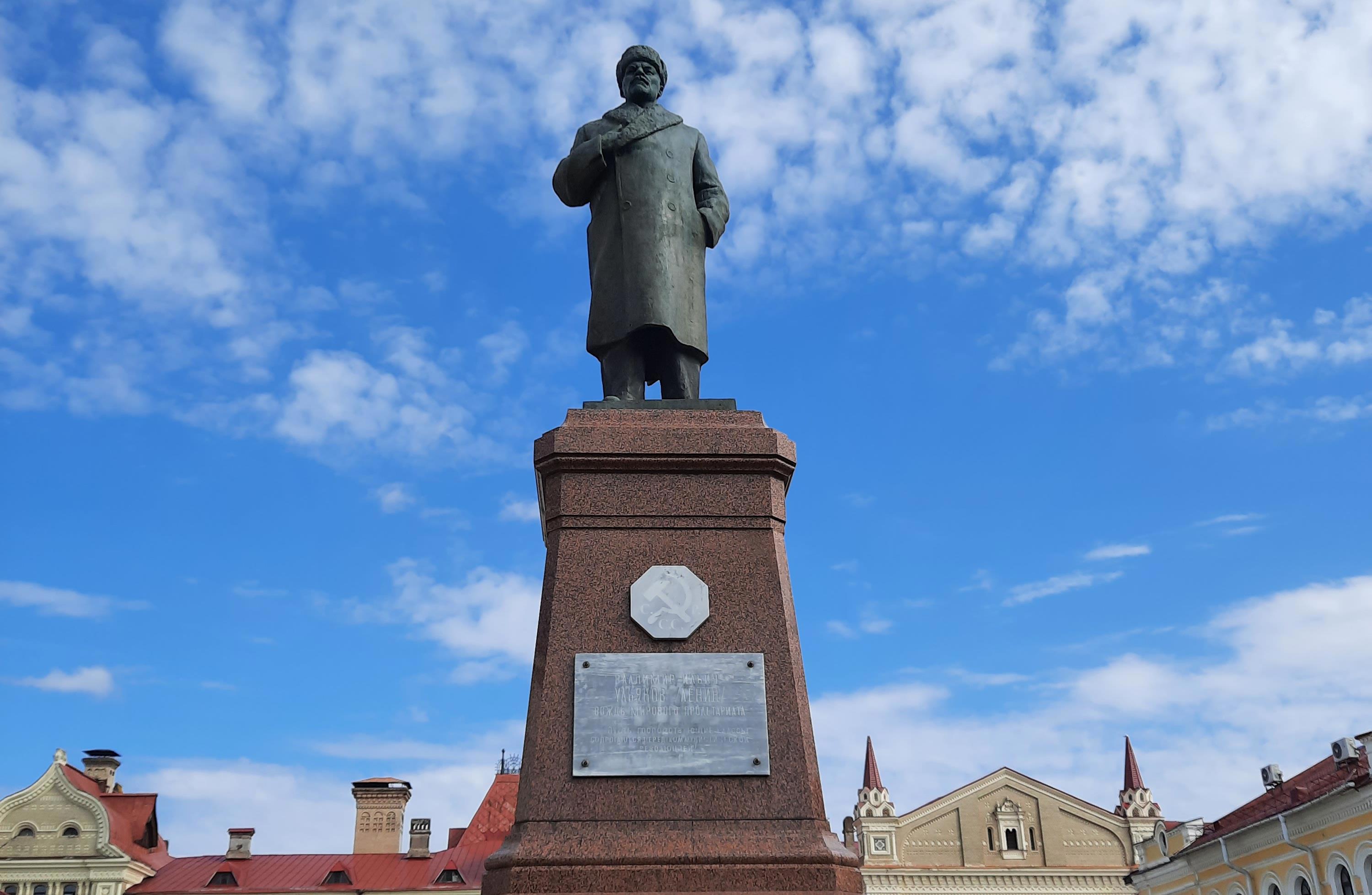 После осмотра этого памятника, мы поехали в центр, было около 9:00 когда мы были там. Народу на улице практически не было, поэтому мы насладились красотами рыбинских улочек без толп местных жителей в перемешку с приезжими. В центре Рыбинска, на Красной площади, стоит памятник В. И. Ленину, который напоминает, что вы не в центре Дрездена, а в нашем российском городке. Ленин тут в зимнем варианте, поэтому он не показывает где сейчас коммунизм, а греет руки у себя за пазухой.