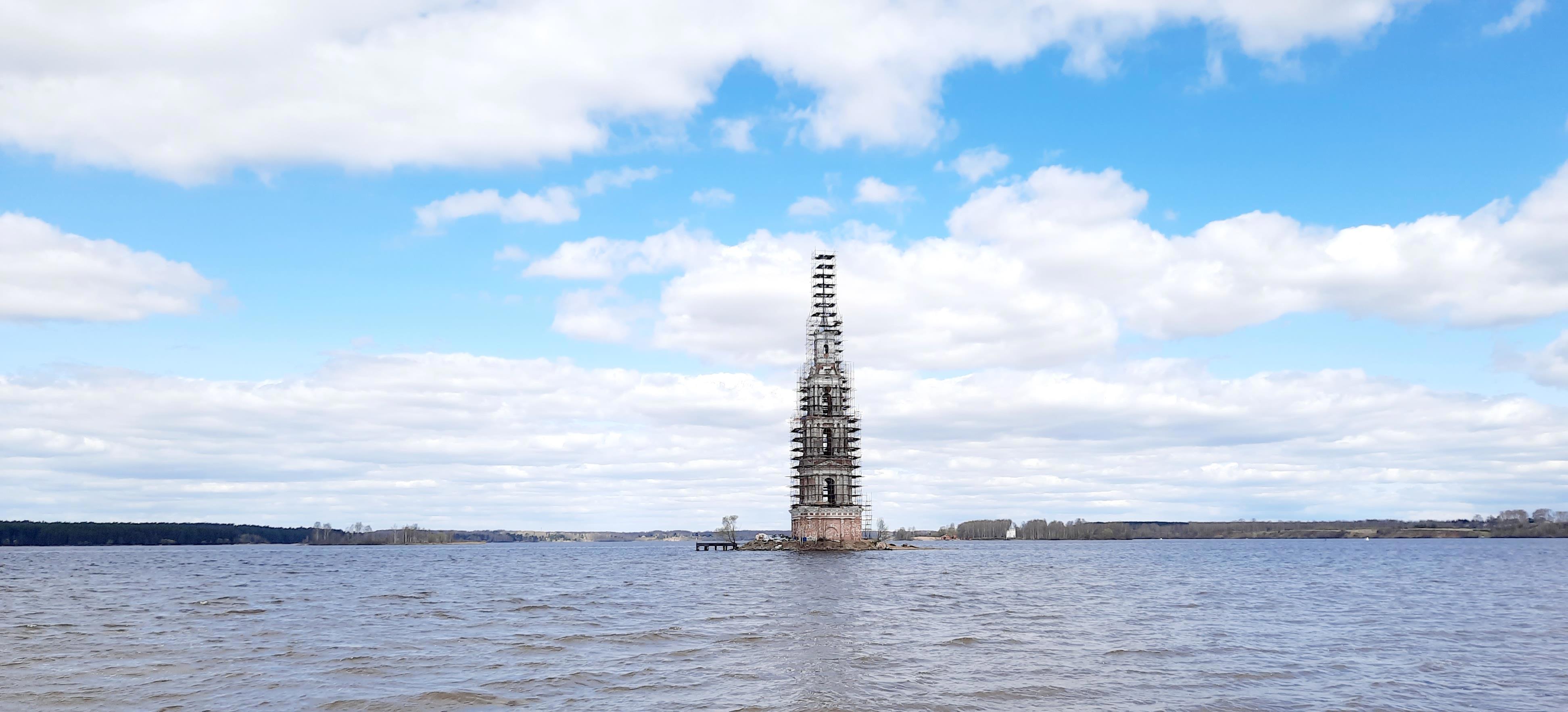 Первая остановка у нас была в Калязине, что находится на берегу Волги. Основная достопримечательность этого городка, затопленная колокольня, одиноко стоящая на небольшом клочке земли посреди водной глади. Когда-то там был город, но после строительства Угличской ГЭС часть города была затоплена, уцелела лишь колокольня. Так, наверное и рождаются слухи о Всемирном Потопе и Атлантиде. Есть легенда, что когда переносили иконы, колокола и прочую церковную утварь из Никольского собора, то один колокол упал в воду и там остался. А местные жители теперь слышат его звон, оккурат перед трагическими событиями типа Великой Отечественной. В 1946 году, после войны, якобы на дно спустился водолаз и привязал проволокой язычок колокола, чтобы он больше не стучал и не предупреждал о трындеце вселенского масштаба, погибать так без набата. Но колокол был упёртый малый или водолаз был без пассатиж. Уже в 1948 году он зазвенел снова, оповещая о землетрясении в Ашхабаде. Потом он предупреждал о вводе войск в Афганистан и прочее, прочее. Интересно, зазвенит ли он перед тем, как Dьюк сойдет с небес на землю, чтобы написать отзыв Мари Пяткиной.