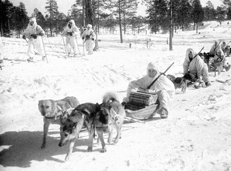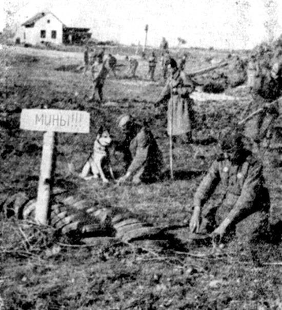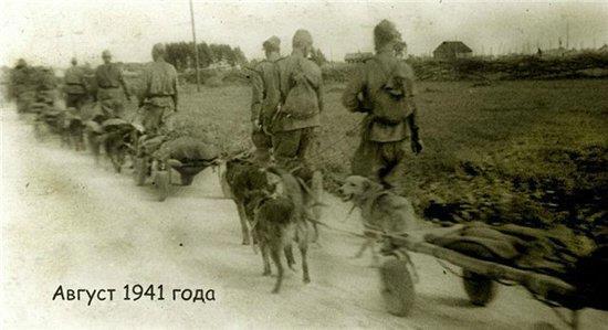 Минно-розыскные собаки - все понятно, что делали. О них я в "Нахальном минировании-2" буду писать. К слову мало писали о том, что собаки - еще и очень неплохой транспорт, особенно там, где лошадям ходить трудно. На фото собаки на волокушах доставляют к передовой боеприпасы. Обратно скорее всего повезут раненых.