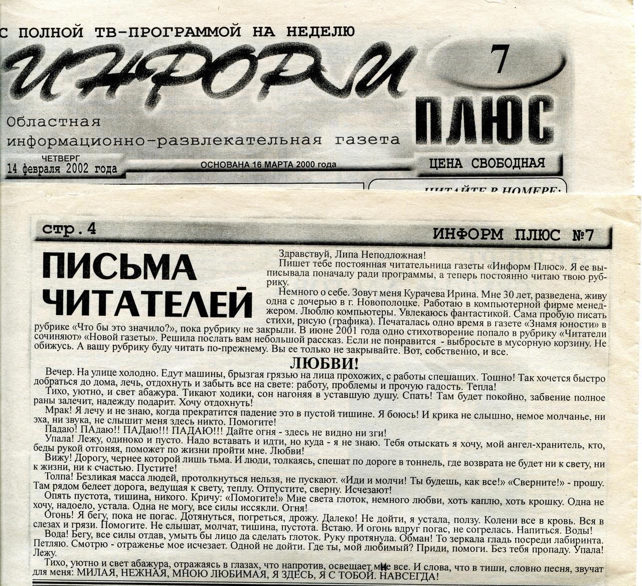 Мой, на тот уже момент, бывший муж сказал, что печатают всякую ерунду в газетах. А ведь он даже не прочитал саму миниатюру. Видимо мои произведения, по его мнению, были недостойны даже газеты… )) А я всё равно радовалась, что миниатюру напечатали в областной газете "Информ плюс" от 14 февраля 2002 г. РБ, г. Витебск. И я продолжила писать.